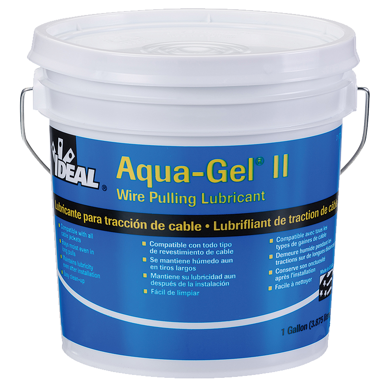 IDEAL Aqua-Gel® II Non-toxic cable pulling lubricant in clear blue color is a polymer-based formula that offers maximum tension reduction in high-stress electrical and communications cable-pulling operations. Lubricant dries to a semi-fluid film that won't clog conduit, and cleans up easily with soap/water. It remains temperature stable over a wide temperature range from 28°F to 180°F (-2°C to 88°C). Lubricant is convenient to apply by hand, brush or pump. It is well suited with all cable types except composite rubber, and clings to cable throughout long pulls. It comes in a 1-quart squeeze bottle, 1-gallon bucket, 5-gallon bucket, and 55-gallon drum. It is environmentally safe, non-toxic, non-flammable and non-corrosive for convenient use. For outdoor use only.