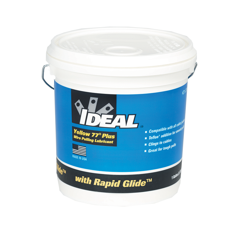 IDEAL Yellow 77® Plus Wire pulling lubricant is a wax-based formula offering superior lubricity due to the Rapid Glide™ polytetrafluoroethylene additive — great for tough pulls. It is safe to use with all cable types. It won't break down/separate after repeated exposure to freezing temperatures and dries to a thin, non-conductive film that won't clog conduit. Yellow 77® Plus has a creamy texture and clings to cable throughout long pulls. Apply conveniently and uniformly by hand or brush. It is a homogeneous blend that requires no mixing and forms surface coat to control evaporation, so it won't dry out. It is environmentally safe, non-toxic, non-flammable and non-corrosive for user safety. Lubricant remains stable in high temperature from 32°F to 190°F (0°C to 88°C). It comes in 1 qt squeeze bottle, 1-gallon bucket, and 5-gallon bucket. Lubricant is UL listed.