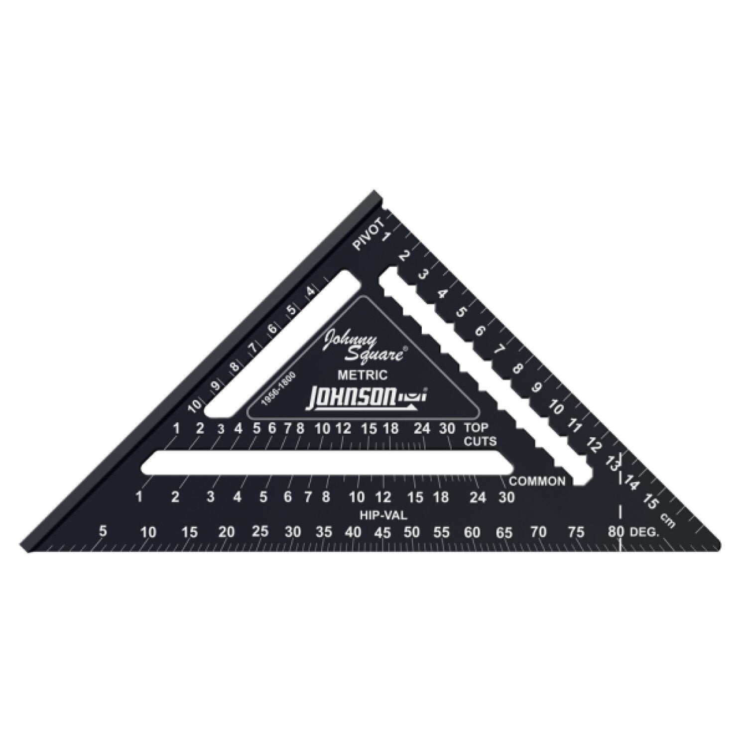 This 18cm Johnny Square® is a versatile tool for builders and contractors. Its thick edge is useful as a saw guide - it can be used directly with the saw against the square for cross cuts or angled cuts using the etched protractor scale. It can be used indirectly as well, using the scribing notches to create a saw cut line for rip cuts. The Johnny Square® also simplifies stair layout - its integrated distance and angle scales let you quickly and accurately mark your cut lines on your stringers. And, of course, this rafter square has scales for cutting hip, valley and jack rafters.