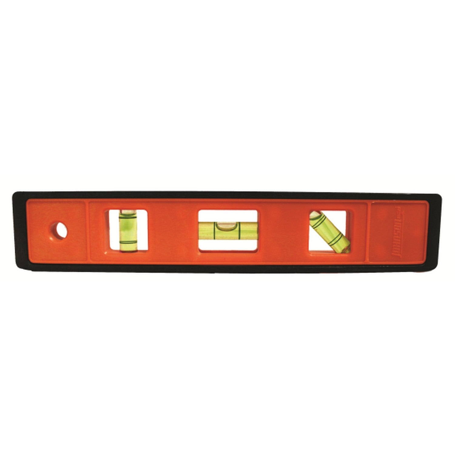 Find plumb, level and 45° quickly and easily with Johnson's 9" Structo-Cast® torpedo level. This level is durable and convenient, with Johnson's unique high-impact and non-corrosive Structo-Cast® frame that was designed to withstand even the toughest jobsite abuse. It also features a top-read window for convenient, easy viewing, while the V-groove frame fits on pipe and conduit.
