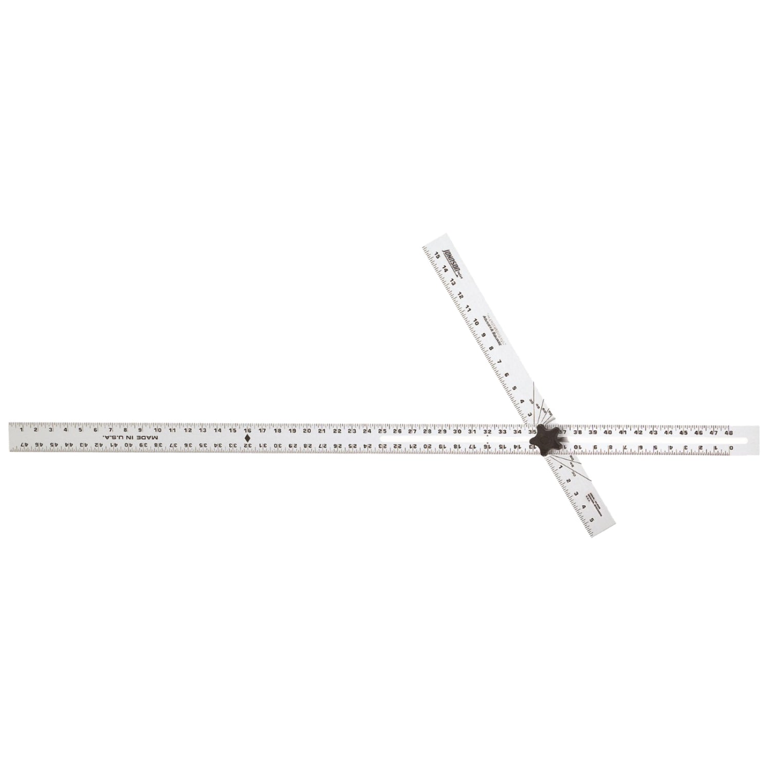 Take errors and guesswork out of your next drywall job with this 48" Adjust-A-Square® from Johnson. The T-square's extruded aluminum blade and head are a robust 1/4" thick, creating a safer straight edge that prevents your utility knife from slipping, while its clear protective anodized finish will keep your tool safe from rust and corrosion. Its precision-machined head and blade lock together for a perfect 90° angle, making it ideal for most drywall work, but its head also adjusts to any angle for the unique angle cuts sometimes needed on the job. This T-square was also designed to be easy to use. It features thermal-bonded black 1/8” & 1/16” graduations that are large and bold for easy reading, and the T-square folds flat for easy transportation to and from your jobsite.