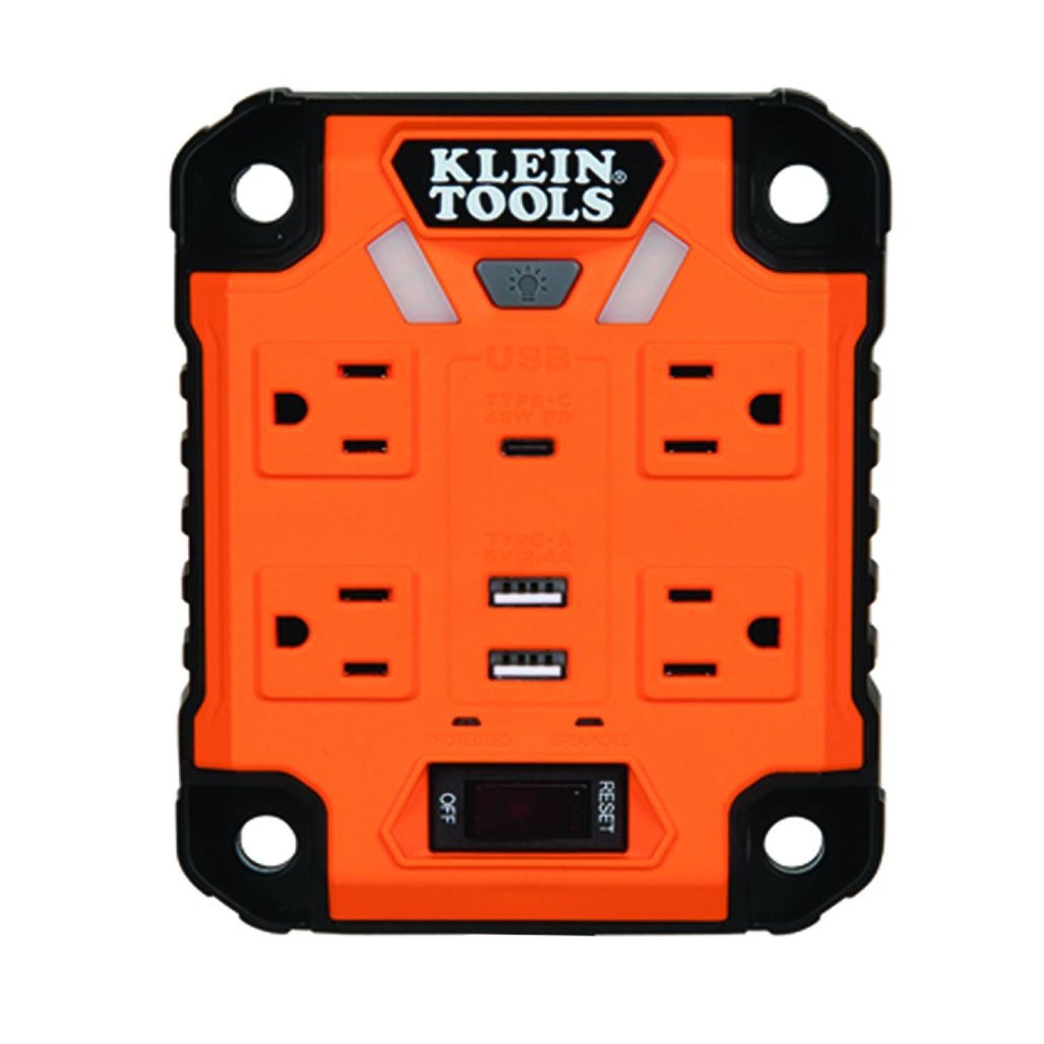 Klein Tools' rugged PowerBox uses powerful magnets to easily mount anywhere in the metal job box or other magnetic surface, and includes built-in hanging holes for fixed mounting locations. Easily distribute power across your job box with 5-Foot durable power cord. Integrated LED lighting illuminates the inside of any dark job box to quickly find gear. Besides the four surge protected 120V outlets, the two USB-A and one 45W USB-C (PD capable) ports allow for convenient charging of personal devices including phones, tablets, and laptops.