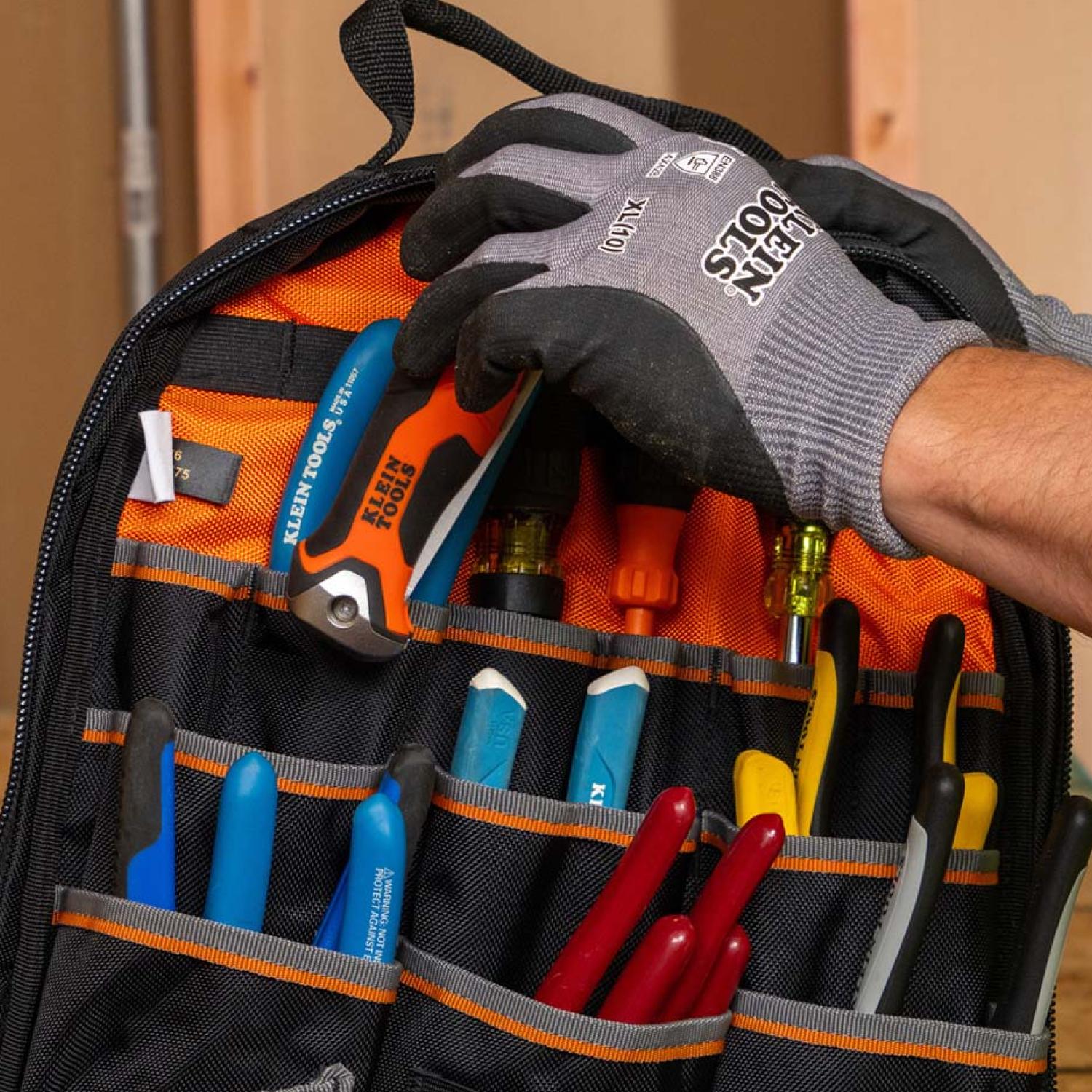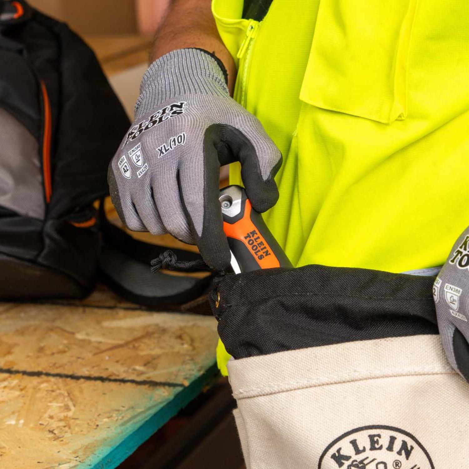 Stay safe from rips or tears in your tool pouch with Klein Tools' Folding Insulation Cutter. The serrated stainless steel blade cuts through foam and fiberglass with ease, and folds back into the comfort-grip handle for added protection. The lockback mechanism secures the blade open for heavy duty use and stable cutting. After the job is done, you can easily fold the blade back down, even with work gloves on.