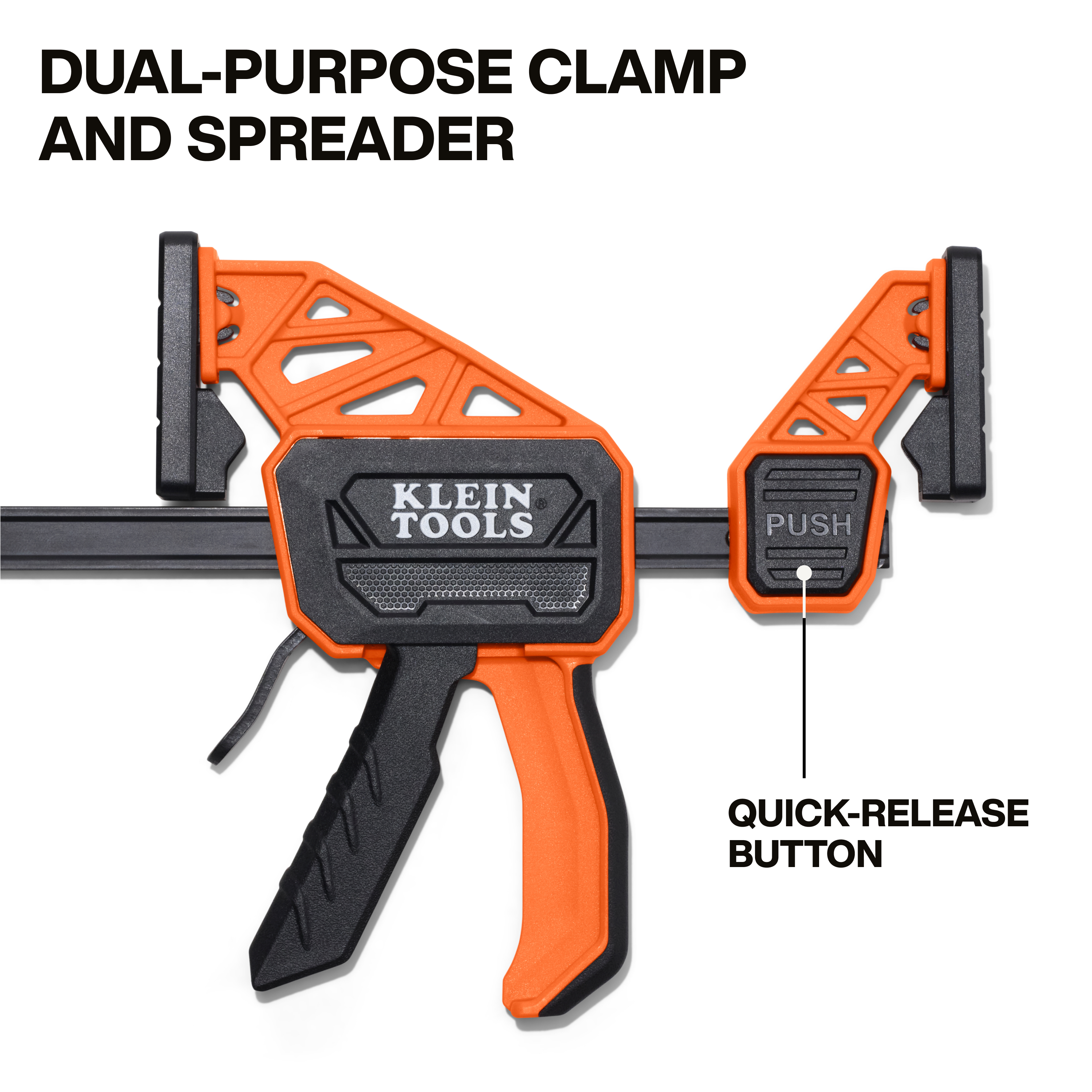 Klein Tools Speed-Klamp 6 and 12-Inch clamps deliver quick one-handed operation with 150-Pound clamping force. Pads pivot and detach to accommodate various surfaces, ensuring a secure grip. Dual-purpose functionality converts the clamp into a spreader for expanded use across woodworking and metalworking applications.