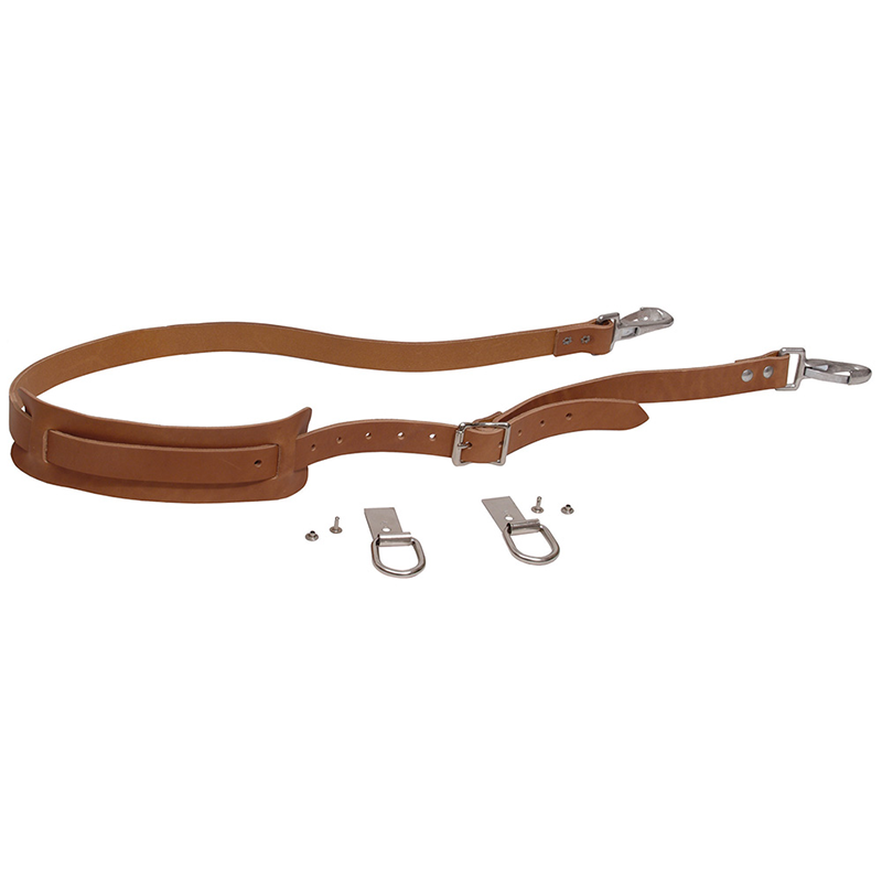 - Complete kit contains leather strap with pad and snap hooks, rings and fasteners for attaching rings to bags
