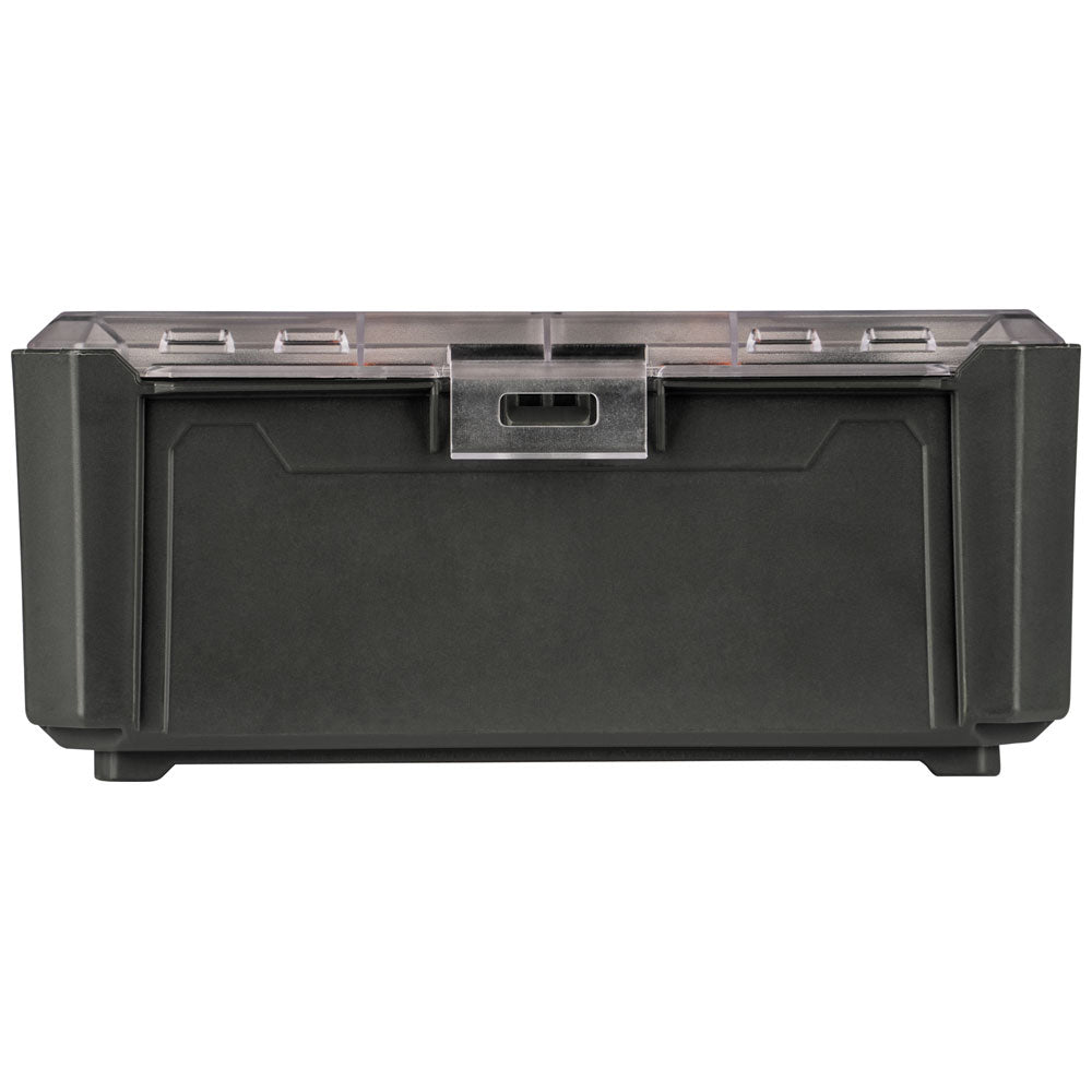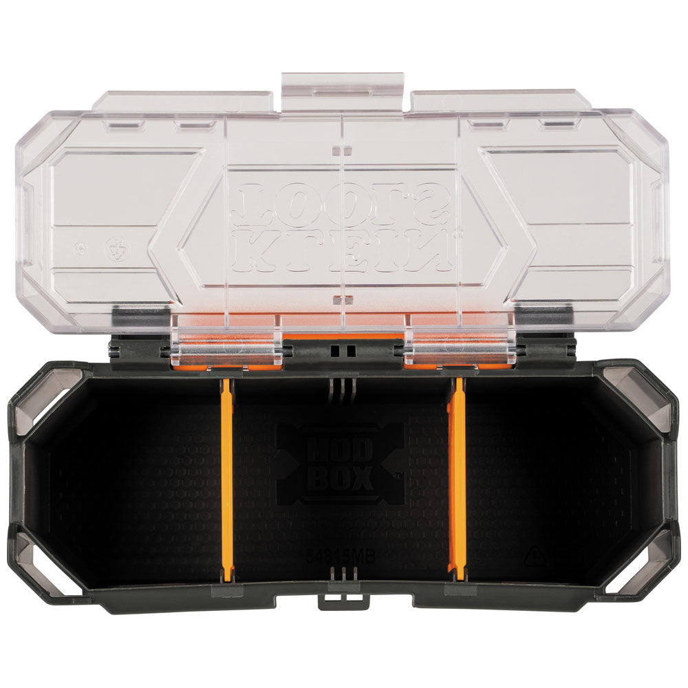 Klein Tools MODbox Parts Bin Rail Attachment connects to side rails to keep tool accessible on the worksite. The storage compartment comes with removable dividers for added modularity. The clear lid provides visibility to contents and snaps shut. Easily connects to the rail system on MODbox components to make a custom mobile workstation.