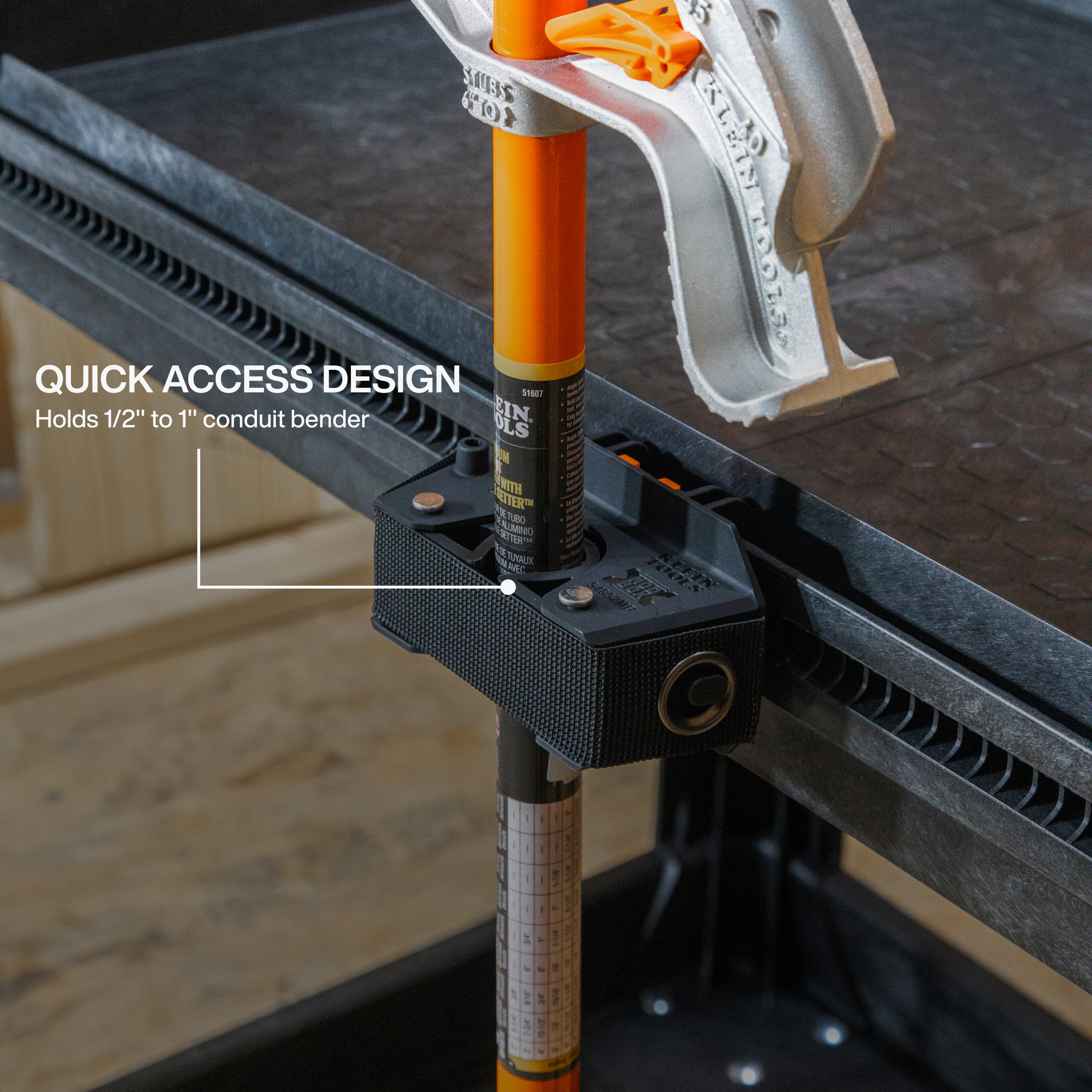 - Tool holder attachment provides quick access to conduit bender while keeping work surface clear, eliminating workflow interruptions and reducing clutter