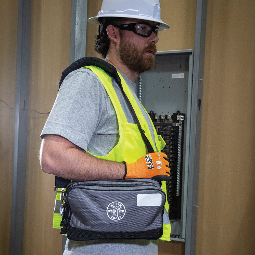 Easily access and organize tools and small parts with the Klein Tools Double-Zipper Tool Bags. These heavy-duty, water-resistant bags feature two compartments with a reinforced bottom; the gray bag measures 12-Inch x 7-Inch and has D-Rings on both ends to attach carabiners or a shoulder strap and the orange bag measures 10-Inch x 6-Inch and has a handle for easy carrying. Both bags have a 3-Inch flat bottom that keeps the bag upright with a white space on front to write contents or name.