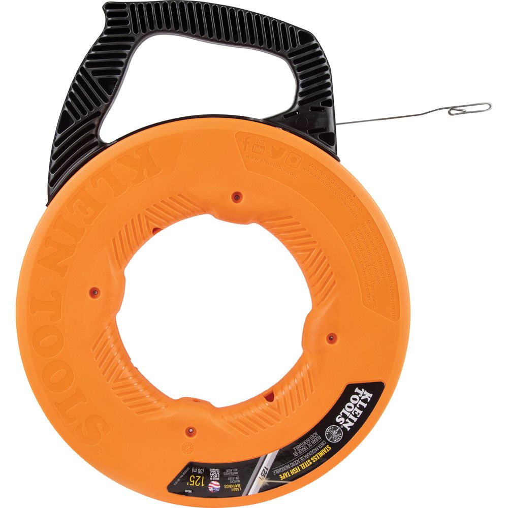 The Klein Tools' 240-Foot Stainless Steel Fish Tape is perfect for wire runs associated with commercial, residential and voice-data-video installations. The optimized housing and handle design decreases payout effort and reduces binding. A multiple-position handle allows for a firm, steady grip as you pull or rewindthe tape. The unique interior case shape combines the leverage of square cases and the comfort of round cases, which makes rewinding tape after a long run easier. The tape features laser-etched descending markings placed at every foot. These markings allow you to accurately measure the depth of conduit runs and determine the amount of tape left to pay out.