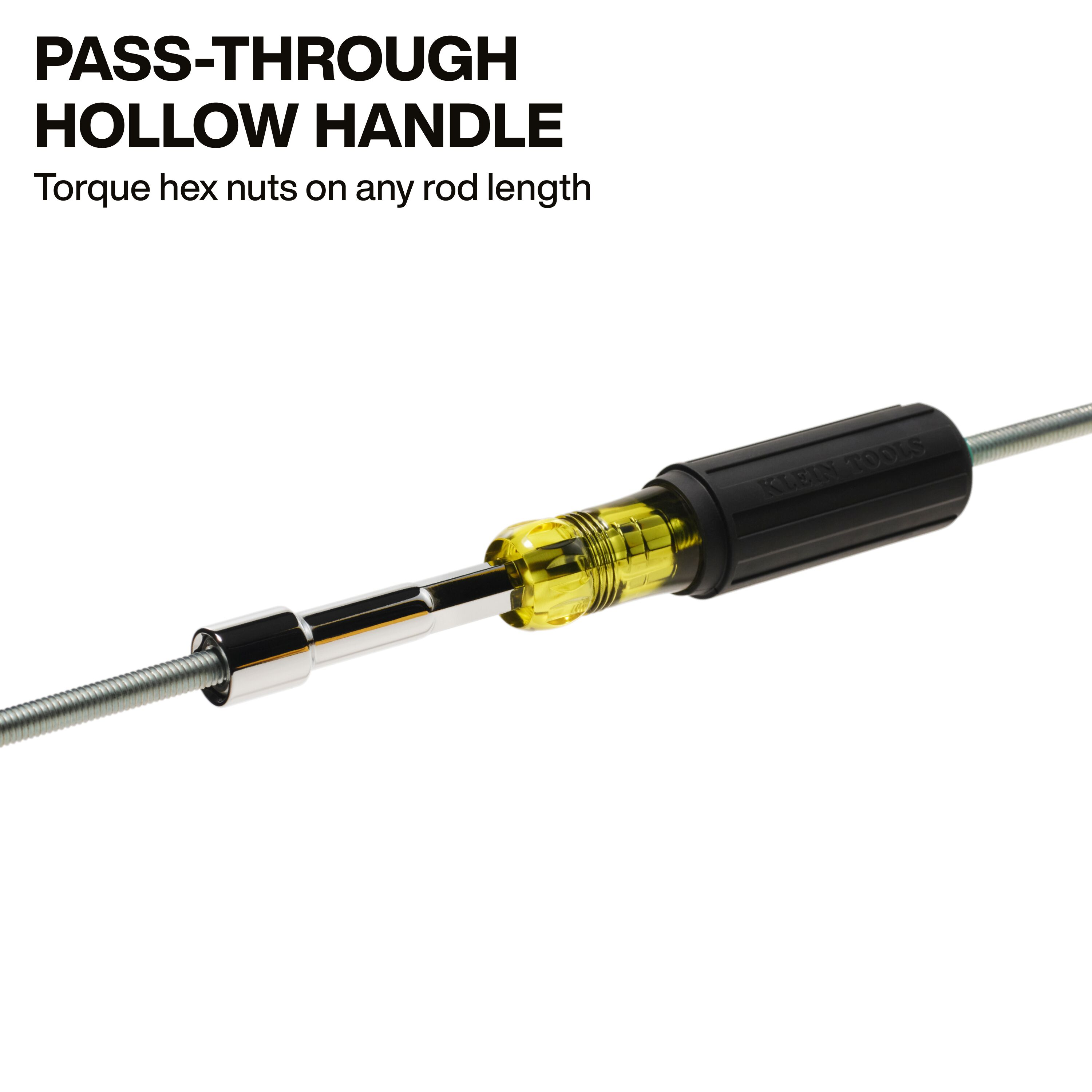 - Pass-through handle and full hollow shaft design allow for effortless torquing of hex nuts onto threaded rods of any length
