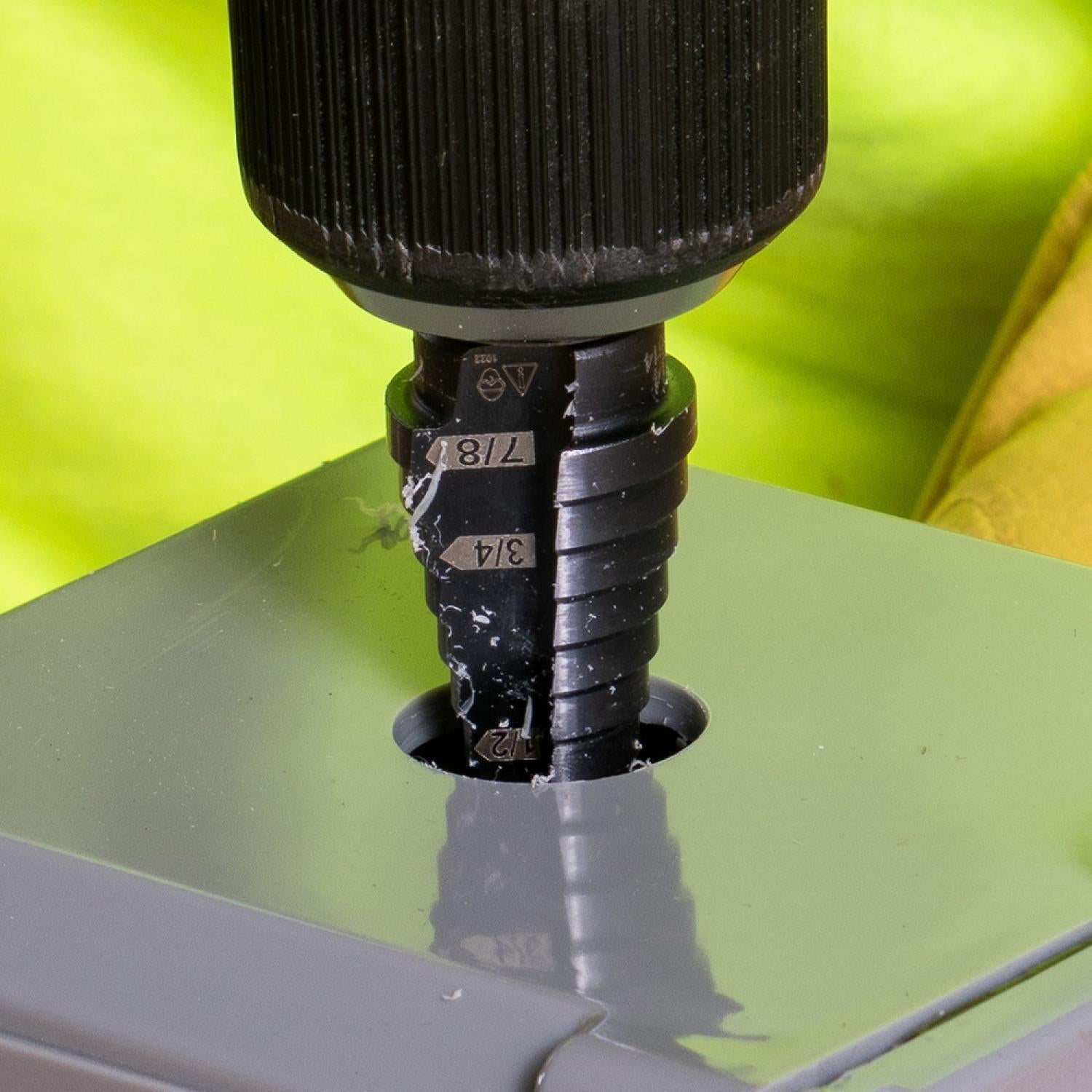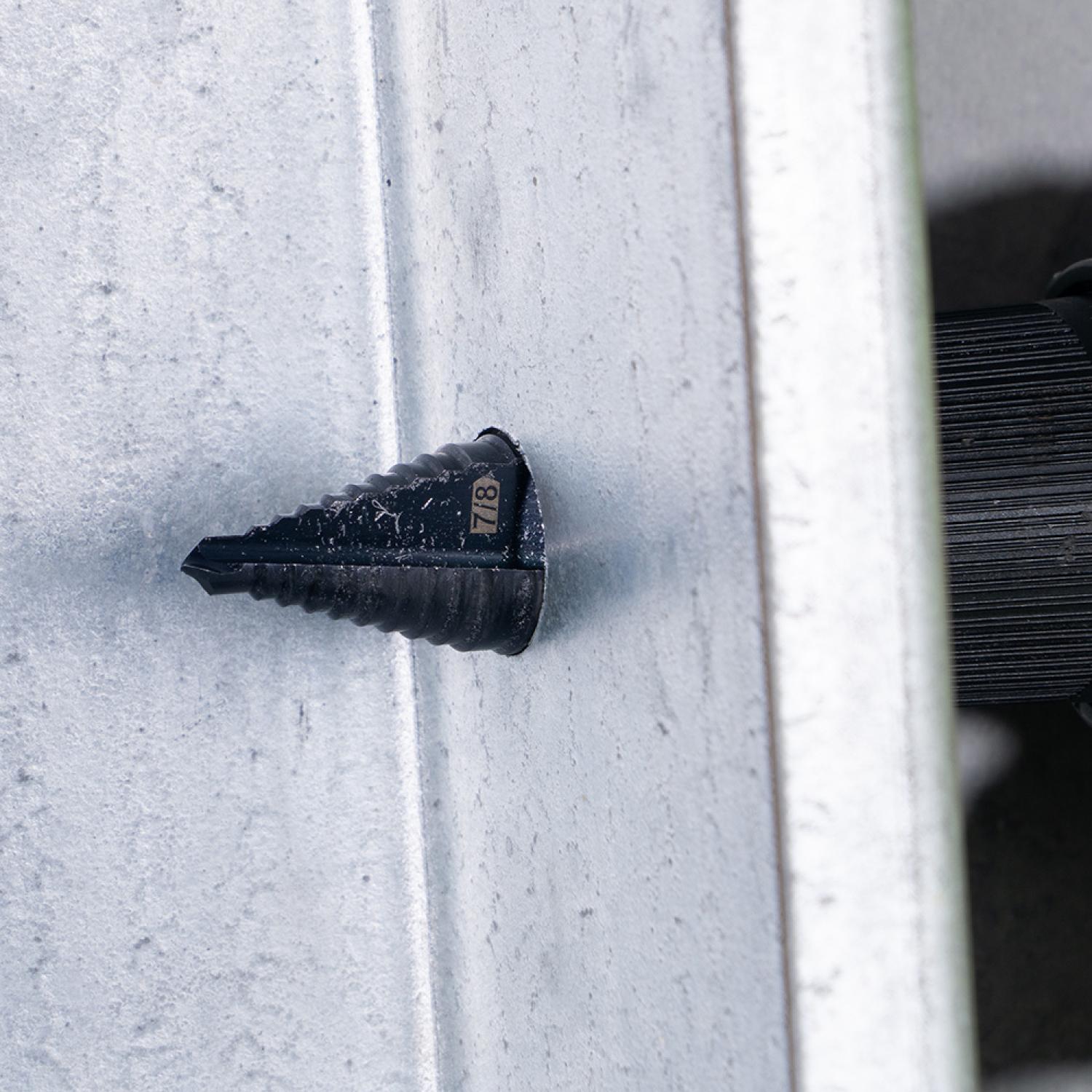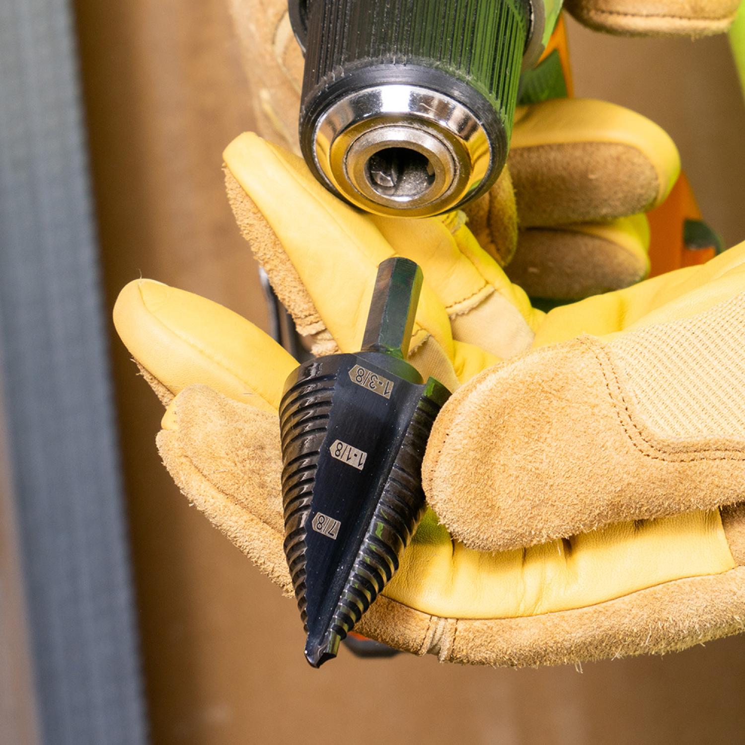 The Premium Electrician's 3/8-Inch Hex Step Bit Set contains 3 step bits sized 7/8-Inch, 1-1/8-Inch, and 1-3/8-Inch for creating hole cutouts in panels and j-boxes to accommodate most commonly used 1/2-Inch, 3/4-Inch, and 1-Inch conduit. Dual straight flutes help pull the step bit through the material for clean cuts. The aluminum titanium nitride coating is 10 times more durable than steamed black oxide for longer bit life. The durable 3/8-Inch hex shank provides a firm, positive grip. The compact, modular case comes with cutting oil and is designed to nest neatly within MODbox toolboxes and on the MODbox Case Adapter Side Rail Attachment.