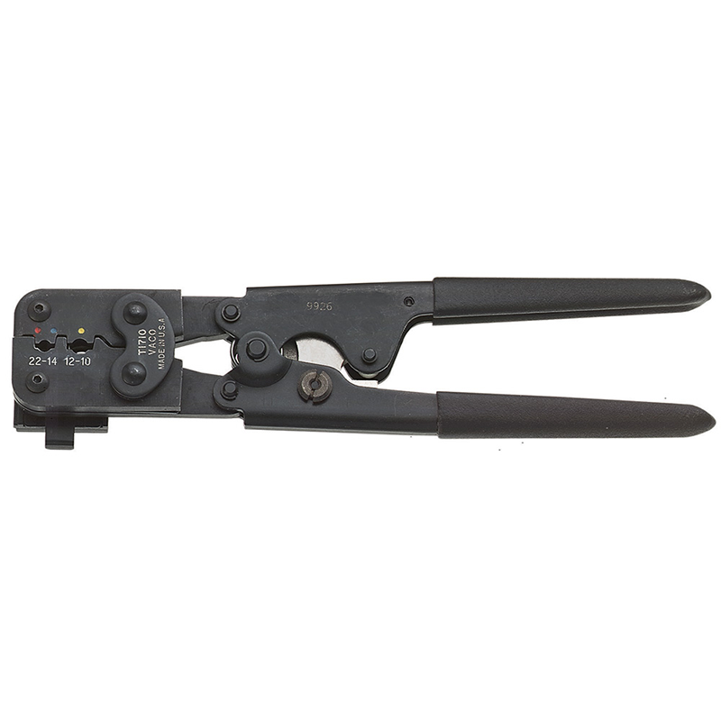 The Klein T1710 Compound-Action Ratcheting Crimper-Insulated Terminals is a compound-action tool that crimps 10-22 AWG insulated terminals to meet or exceed MIL-SPEC pull-out tests The Klein T1710 Compound-Action Ratcheting Crimper-Insulated Terminals features built-in ratchet with safety release assures uniform crimps every time, a compound lever-action of narrow-span handles puts more crimping power into each squeeze, a special locator that quickly positions terminal for double crimp, and comfort-grip plastic handles.