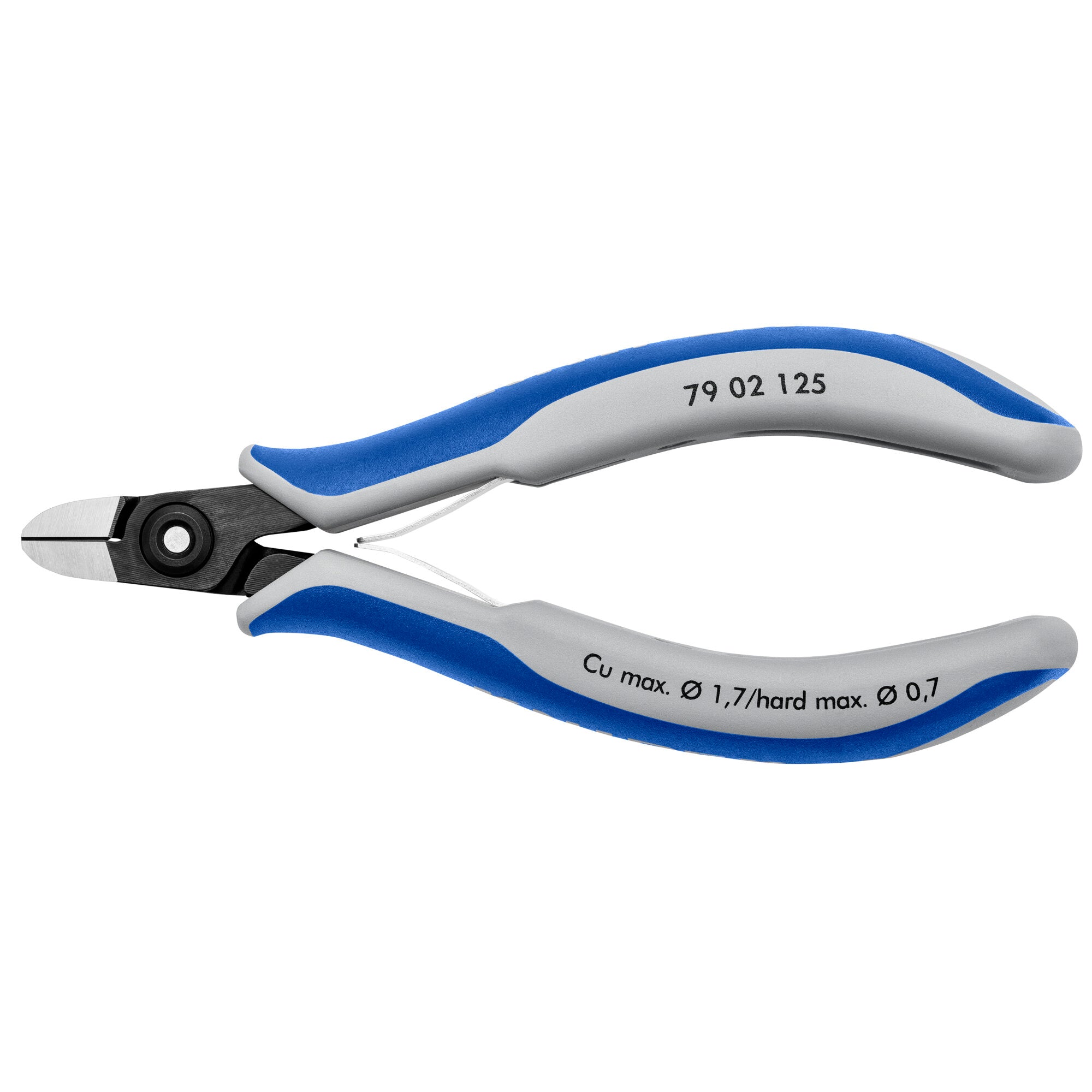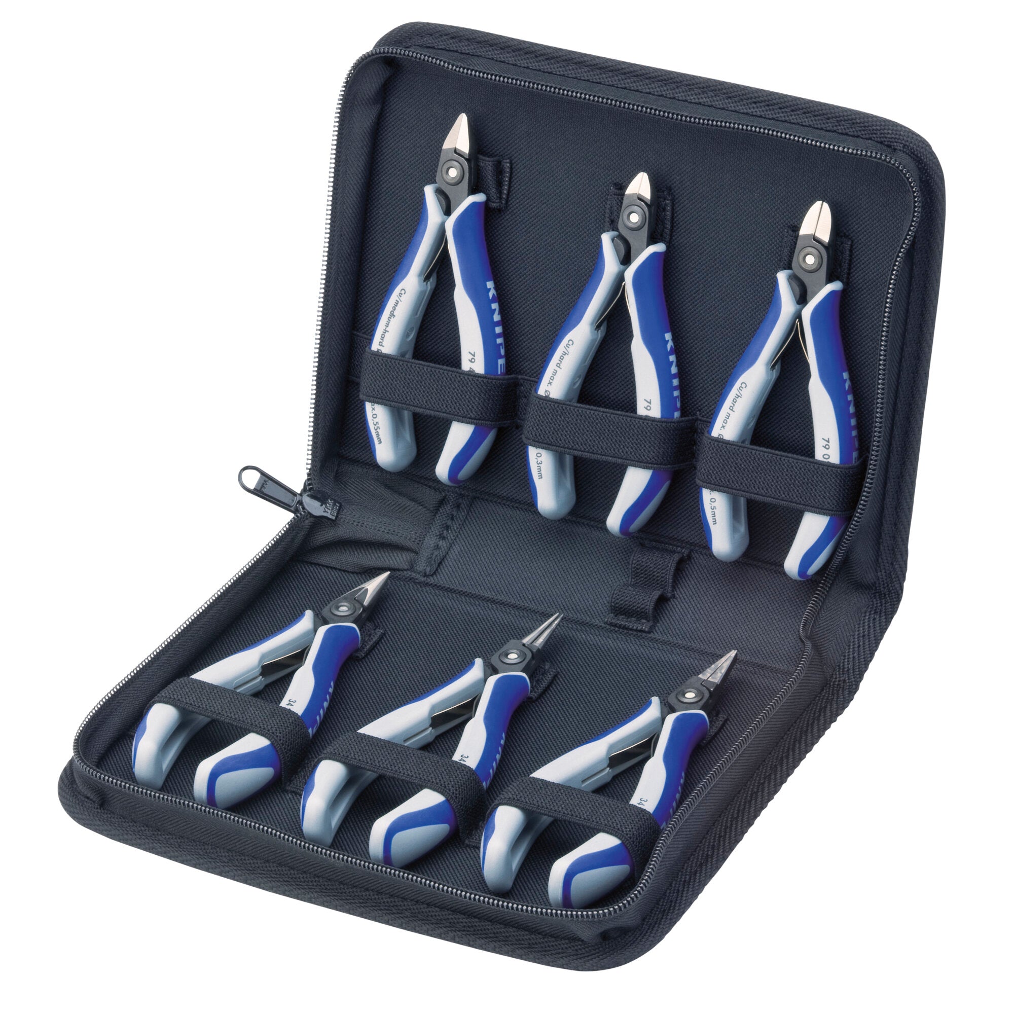 The KNIPEX Precision Electronics Pliers are expertly crafted tools designed for delicate and precise work. With their slim, pointed jaws and exceptional gripping capabilities, these pliers offer unparalleled control when handling small components. Set includes Electronic Pliers (various tips) and Electronics Diagonal Cutters in a zipper pouch. Zippered pouch made of durable polyester fabric with sewn in elastic bands to hold tool securely. Approximately 20% lighter than conventional electronics pliers. Bolted joint and carefully manufactured joint surfaces for even, low-friction movement throughout the entire opening range. 34 12 130 (Flat tips), 34 22 130 (Half round tips), 34 32 130 (Round tips) - 5 1/4: electronics Pliers. For very precise assembly work, e.g. in electronics and fine mechanics. Used for gripping, holding and bending. Smooth ground gripping surfaces. Double spring for a gentle and even opening. 79 02 120 (4 3/4"), 79 02 125 (5"), 79 42 125 (5") - Electronics Diagonal Cutters. Precision pliers for ultra fine cutting work in electronics and fine mechanics. Very precisely ground and sharp cutting edges with very small bevels for precise cutting work on small electronic components. Double spring for a gentle and even opening. Low-friction movement throughout the entire opening range.
