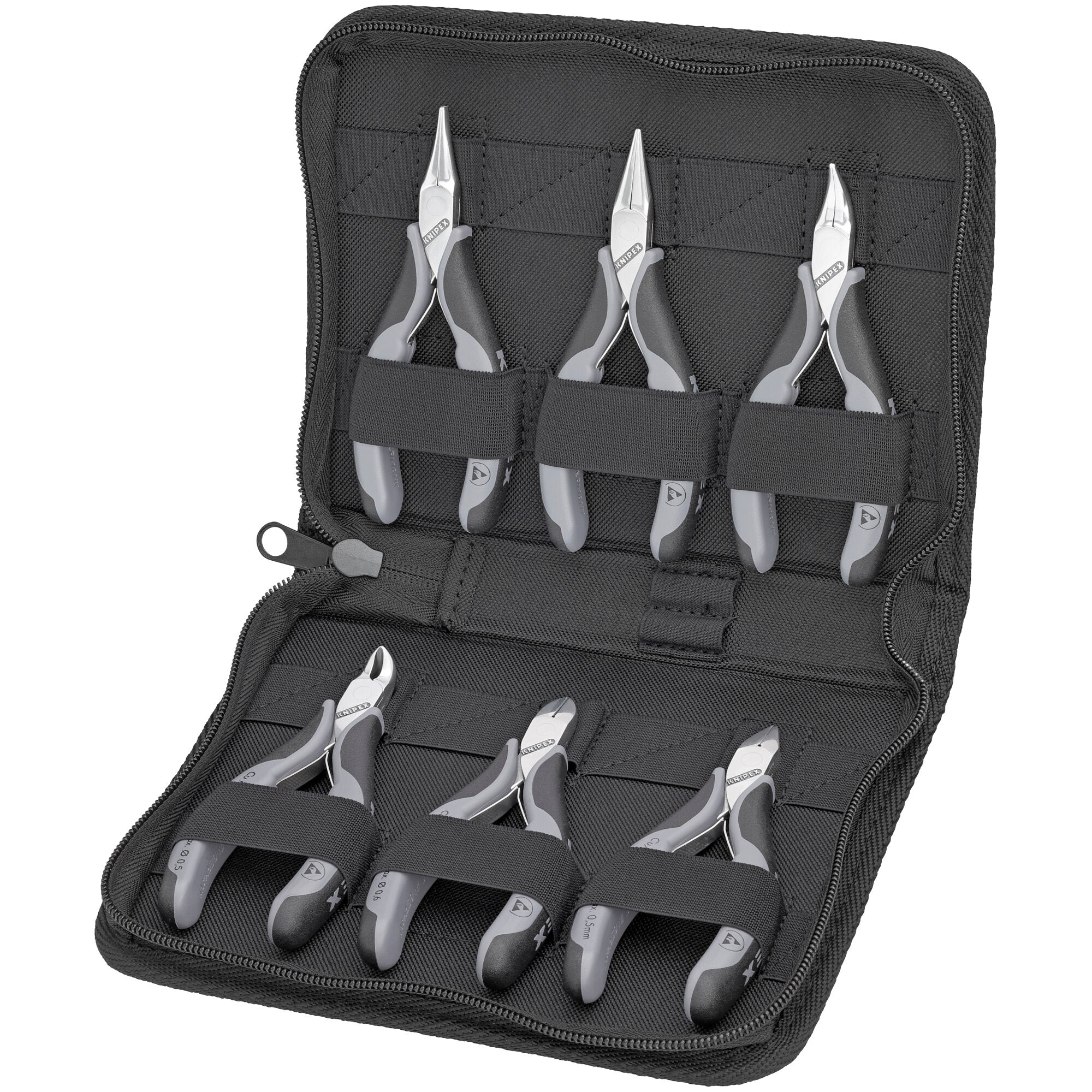 The KNIPEX Electronics ESD Pliers Set is a specially designed collection of pliers that feature electrostatic discharge (ESD) handles. Offering safety and reliability, this electronics pliers are ideal for working with sensitive electronic components. ESD (electrostatic discharge) handles discharge electrostatic energy through the handles in a gradual and controlled manner which protects components endangered by electrostatic discharge. Set includes Electronics Pliers (various tips), Electronics Angled Pliers, Electronics End Cutting Nippers and Electronics Diagonal Cutters in a zipper pouch. Zippered case made of durable polyester fabric with sewn in elastic bands. 35 12 115 ESD (Flat tips), 35 22 115 ESD (Half round tips) and 35 42 115 ESD (45° Angled-Half round tips) - 4 1/2" Electronics Pliers. Precision pliers for ultra fine assembly work in electronics and fine mechanics. Designed for gripping, holding and bending small components. Smooth gripping surfaces and rounded edges prevent damage to components. 64 32 120 ESD - 4 3/4" Electronics End Cutting Nippers. Precision pliers for ultra fine cutting work in electronics and fine mechanics. Low friction double spring for gentle and even opening. The mirror polish together with a fine film of oil offer effective rust protection - no circuit faults caused by peeling chrome from plated tools. 77 02 115 ESD and 77 32 115 ESD (4 1/2" Electronics Diagonal Cutters). For fine cutting work in electronics and fine mechanics. Sturdy, zero-backlash box joint. Low friction double spring for gentle and even opening.