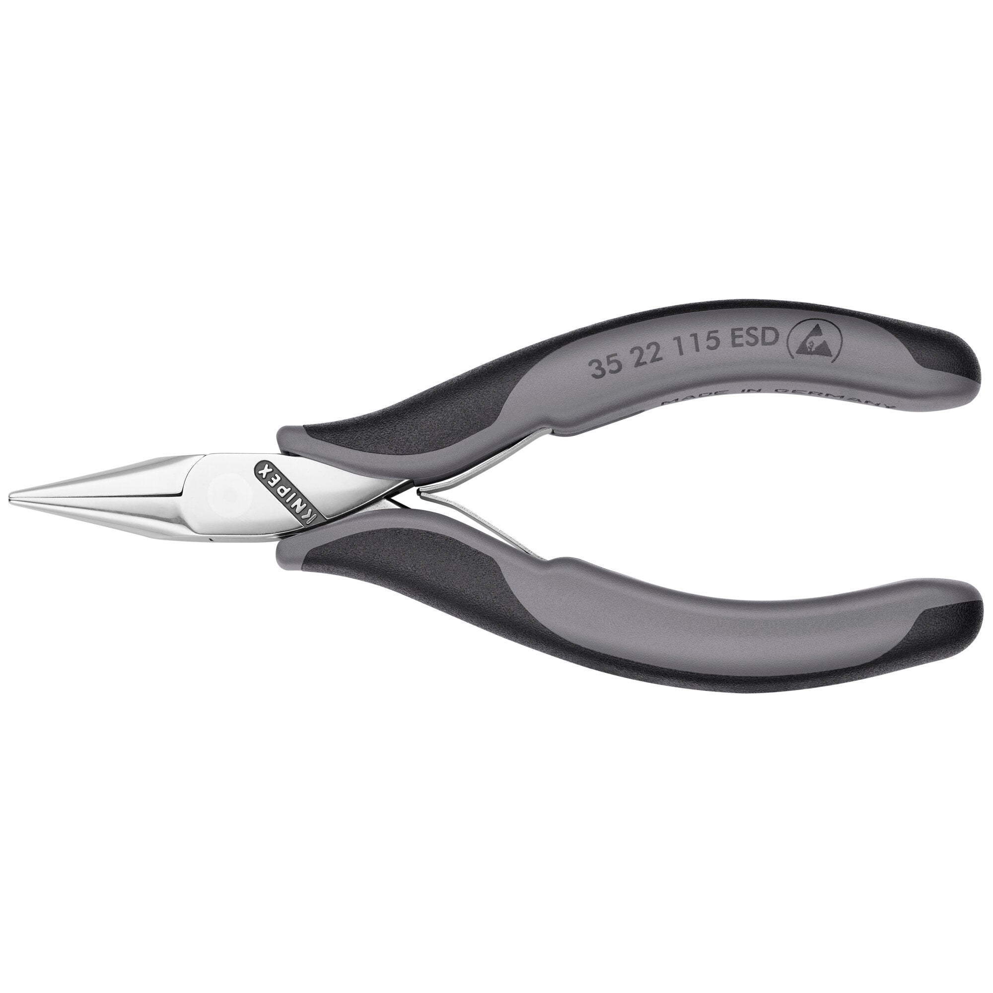 Precision pliers for ultra fine assembly work in electronics and fine mechanics. Designed for gripping, holding and bending small components. Sturdy, zero-backlash box joint. Smooth gripping surfaces and rounded edges prevent damage to components. Low-friction double spring for gently and even opening. Used for gripping, holding and bending. The mirror polish together with a fine film of oil offer effective rust protection - no circuit faults caused by peeling chrome from plated tools. Half-round, smooth jaws. ESD (electrostatic discharge) handles discharge electrostatic energy through the handles in a gradual and controlled manner which protects components endangered by electrostatic discharge. Ball bearing steel.