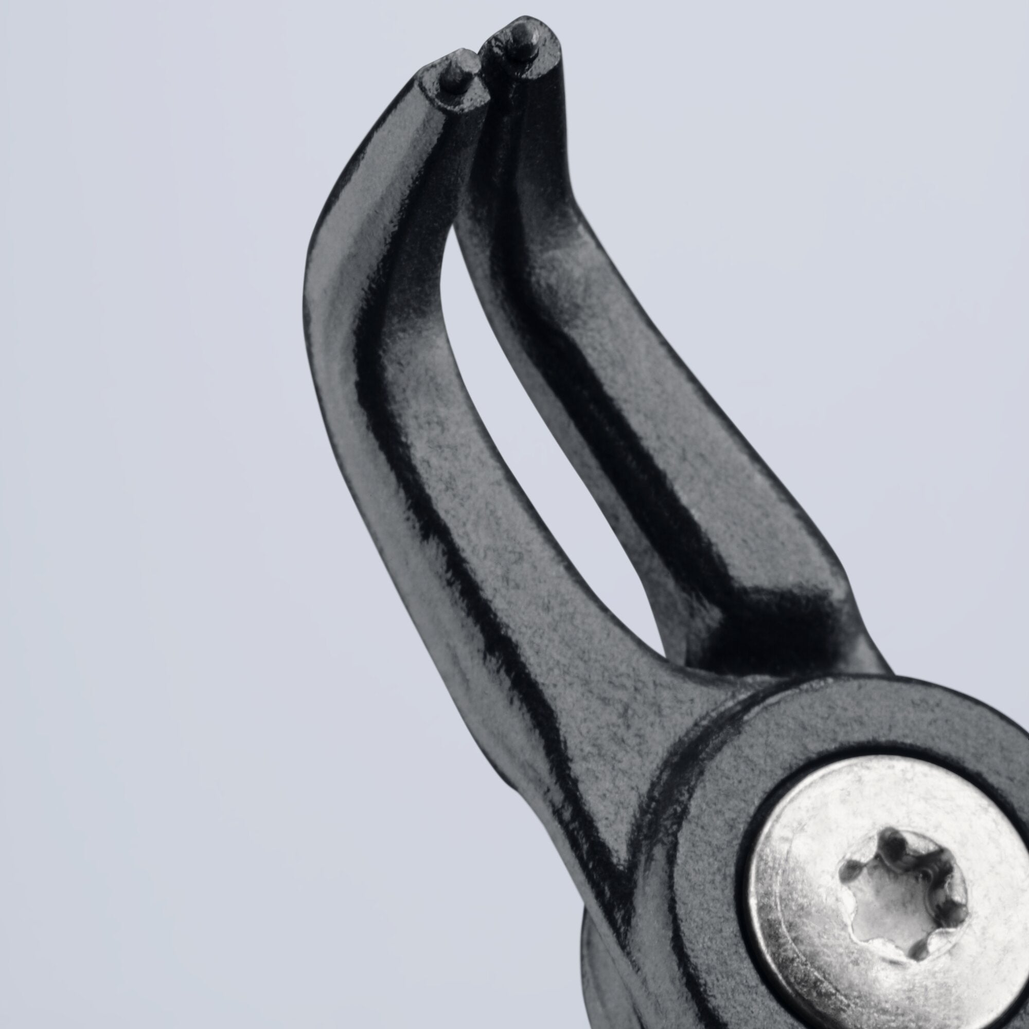 Precision internal circlip pliers for installing or removing circlips in bore holes. Overexpansion limiter with screw stop prevents overexpansion of circlips. Adjustment using Allen Wrench. For fitting snap rings into bores, ranging from 5/16"-1/2". Inserted 90˚ angled tips for reliable work. Circlips are held securely, large contact faces and the position of the tips make it difficult for the circlip to fly off. Bolted joint: precise, zero-backlash operation of pliers. Heavy-duty continuous operation: up to 10 times longer service life than turned tips. Inserted tips: spring steel wire, drawn. Pliers body: chrome vanadium electric steel; forged, oil-hardened.