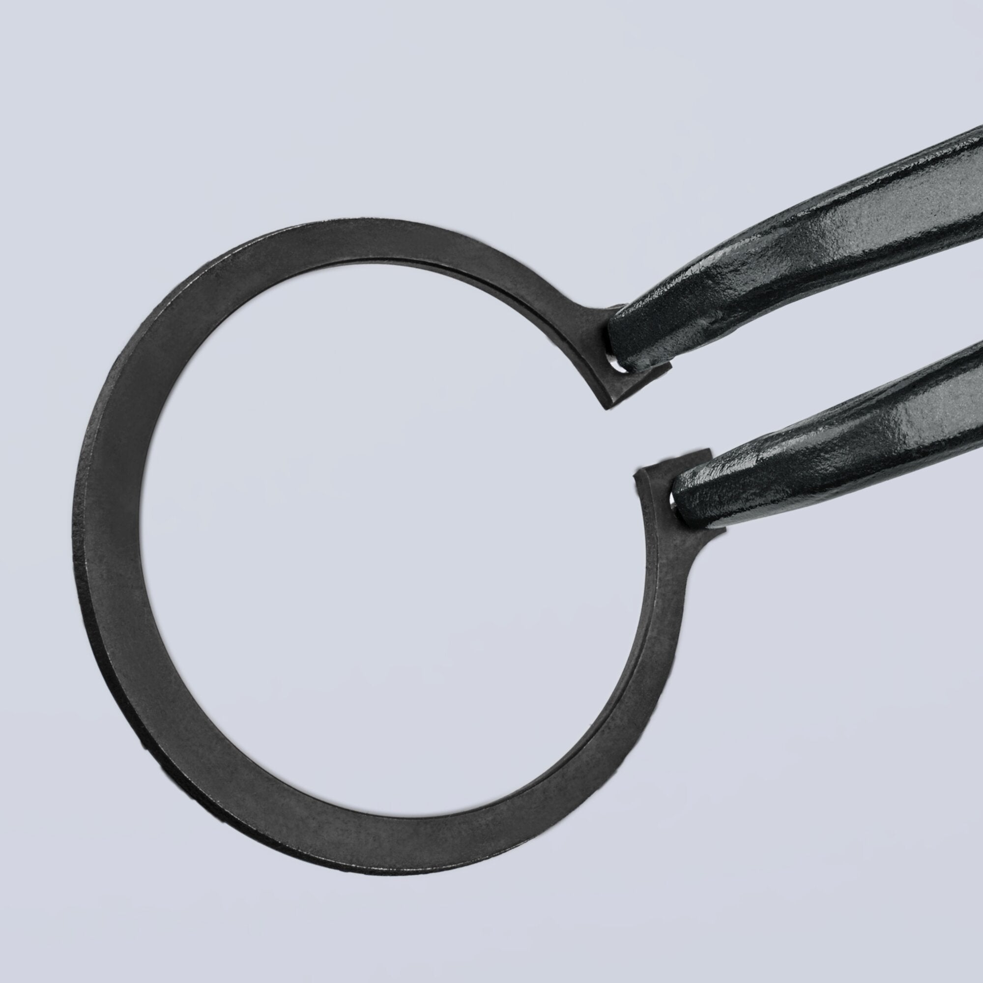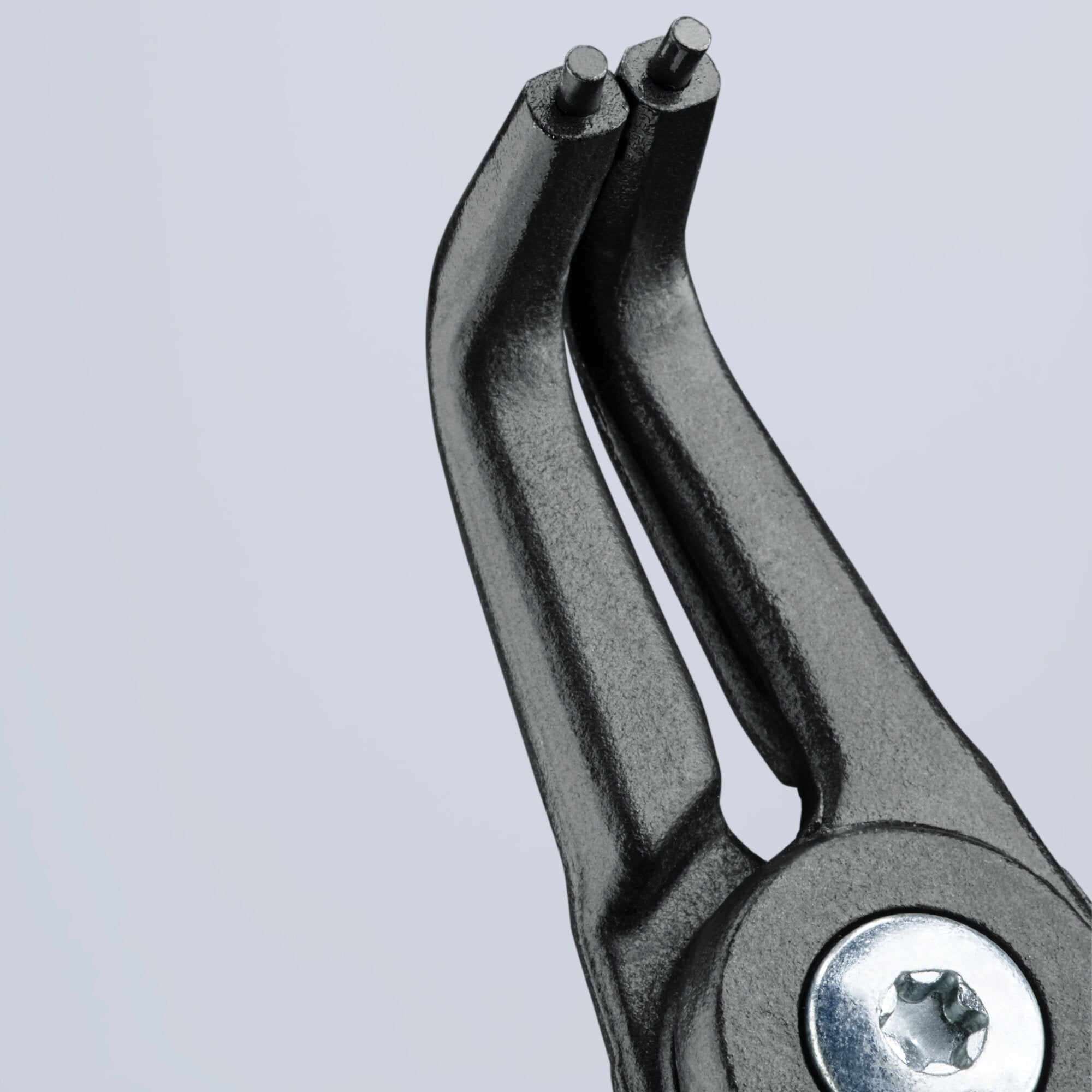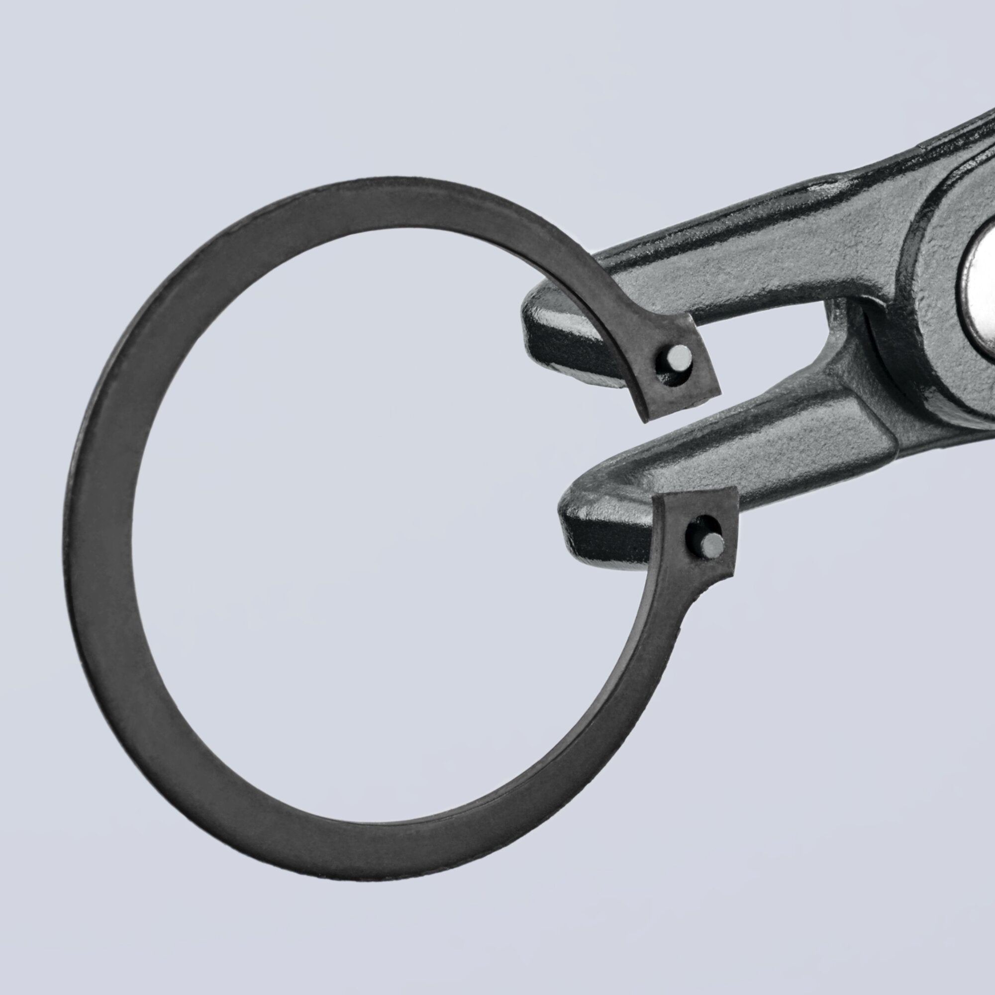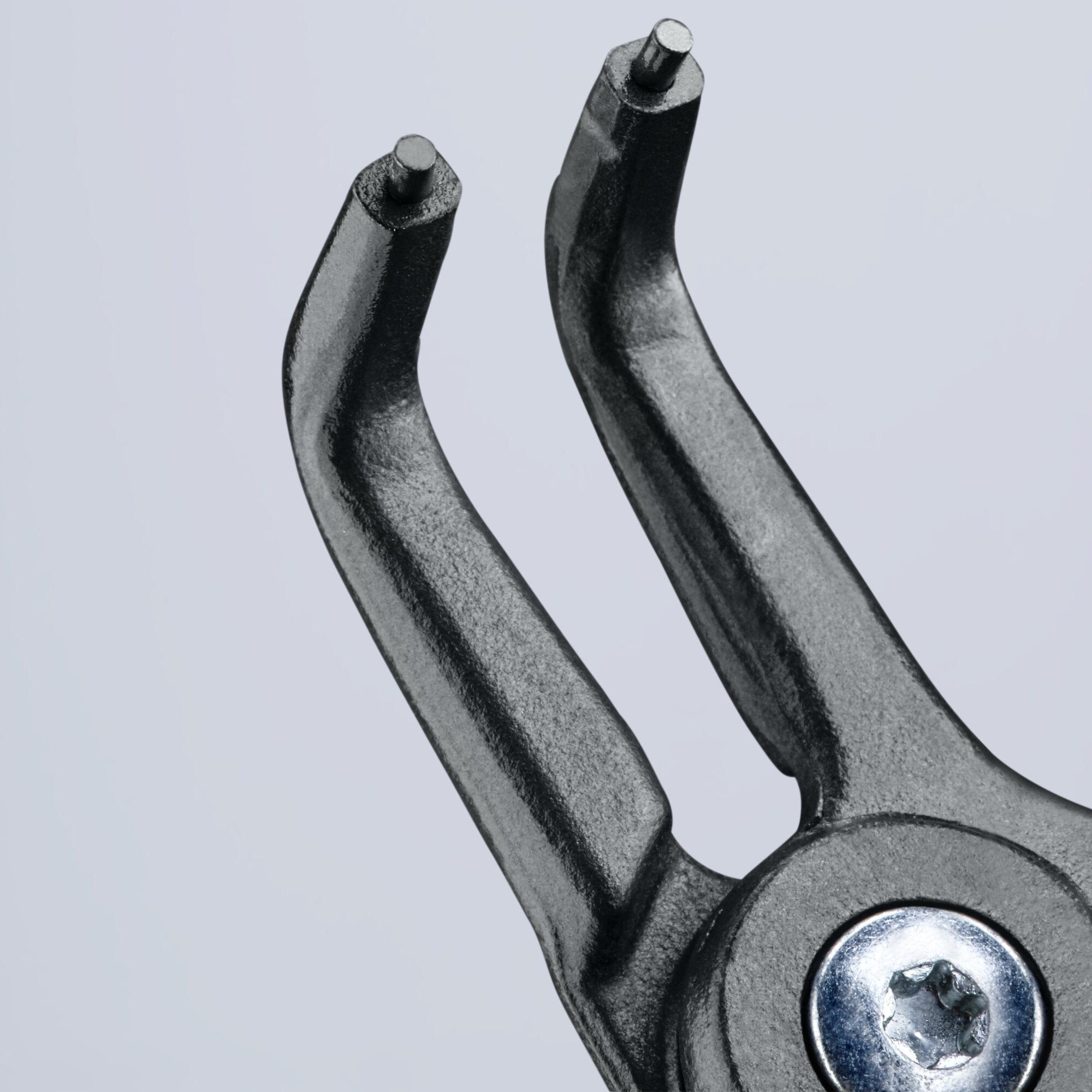 Precision external circlip pliers for installing or removing circlips on shafts. Overexpansion limiter with screw stop prevents overexpansion of circlips. Adjustment using Allen Wrench. For fitting snap rings on shafts, ranging from 3/4" - 2 23/64". Inserted 90˚ angled tips for reliable work. Circlips are held securely, large contact faces and the position of the tips make it difficult for the circlip to fly off. Bolted joint: precise, zero-backlash operation of pliers. Heavy-duty continuous operation: up to 10 times longer service life than turned tips. Internal opening spring, protected and captive. Inserted tips: spring steel wire, drawn. Pliers body: chrome vanadium electric steel; forged, oil-hardened.