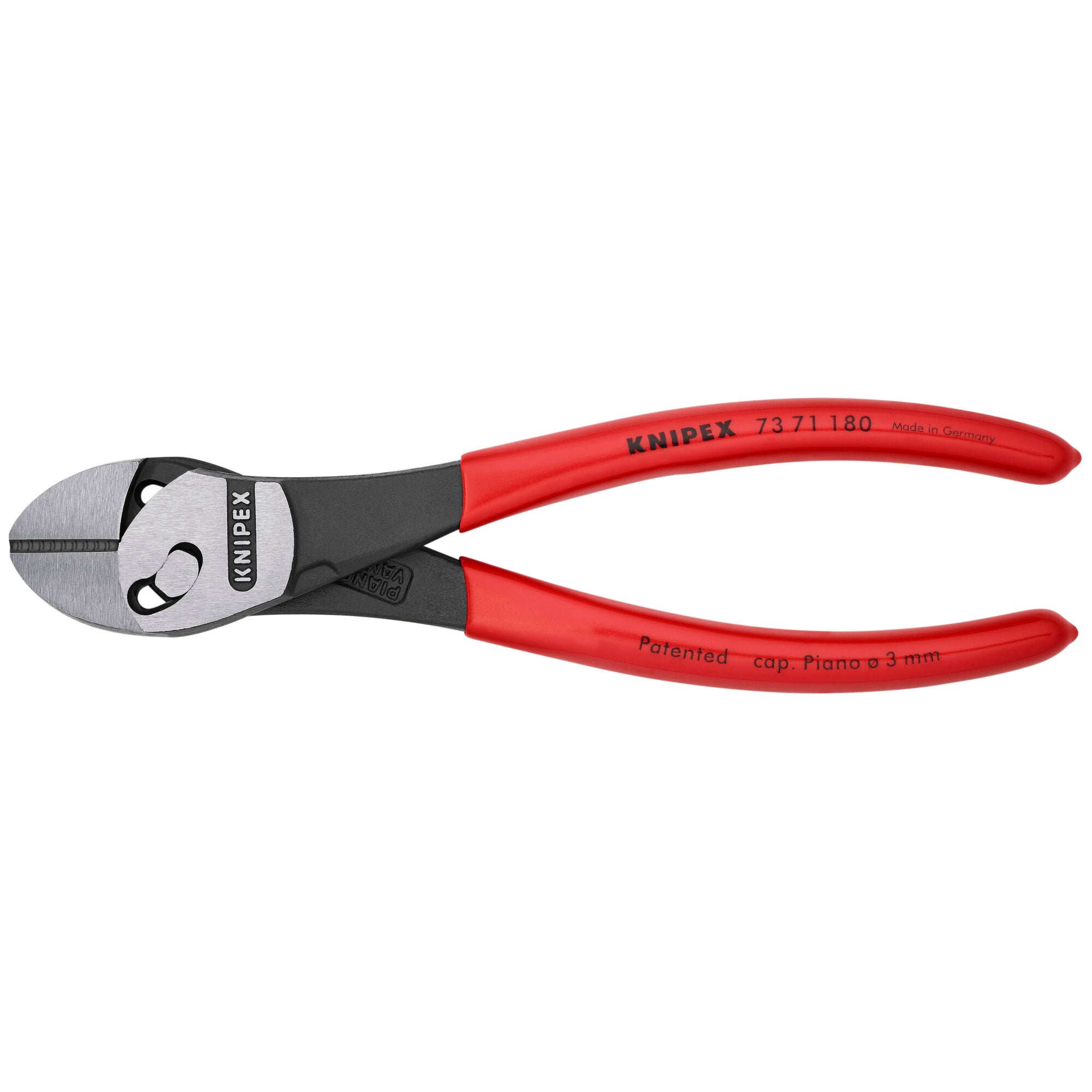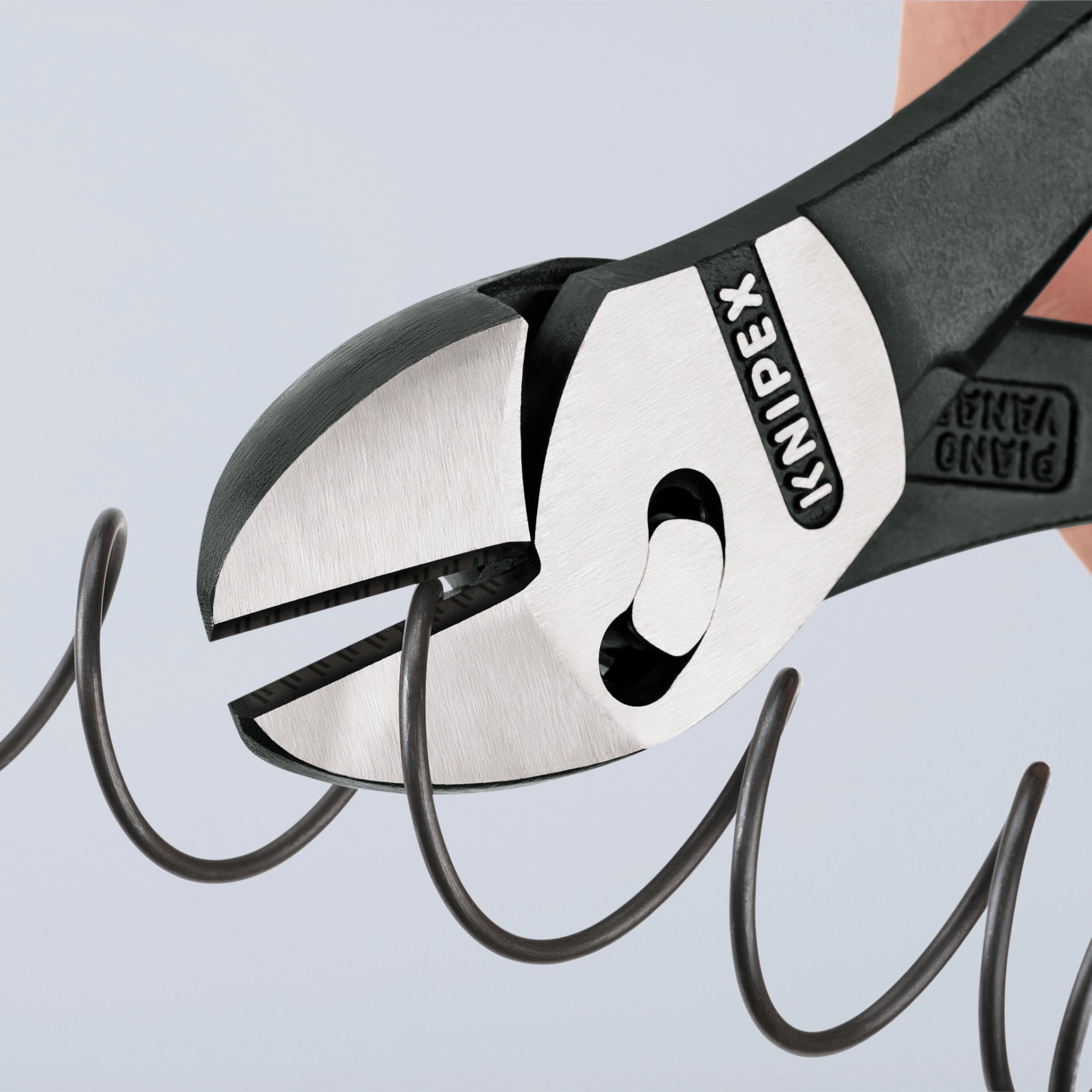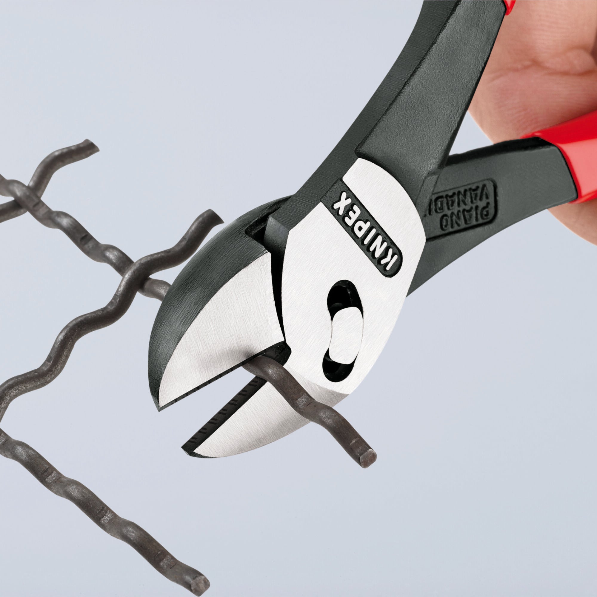 Superior high leverage diagonal cutter with patented double joint. Cuts 50% easier than KNIPEX high leverage diagonal cutters of the same size. Ideal transmission of force due to double-hinged design. Reliably cuts all types of wire, including steel tape. For rough or very fine cutting. For comfortable cutting, repetitive cutting or extremely hard cutting jobs. High degree of stability and zero backlash due to precisely milled forged-in axle. Cutting capacity - up to 7/32" for soft, up to 3/16" for medium, up to 1/8" for hard, and up to 1/8" for piano wire. Chrome vanadium heavy-duty steel; forged, oil-hardened.