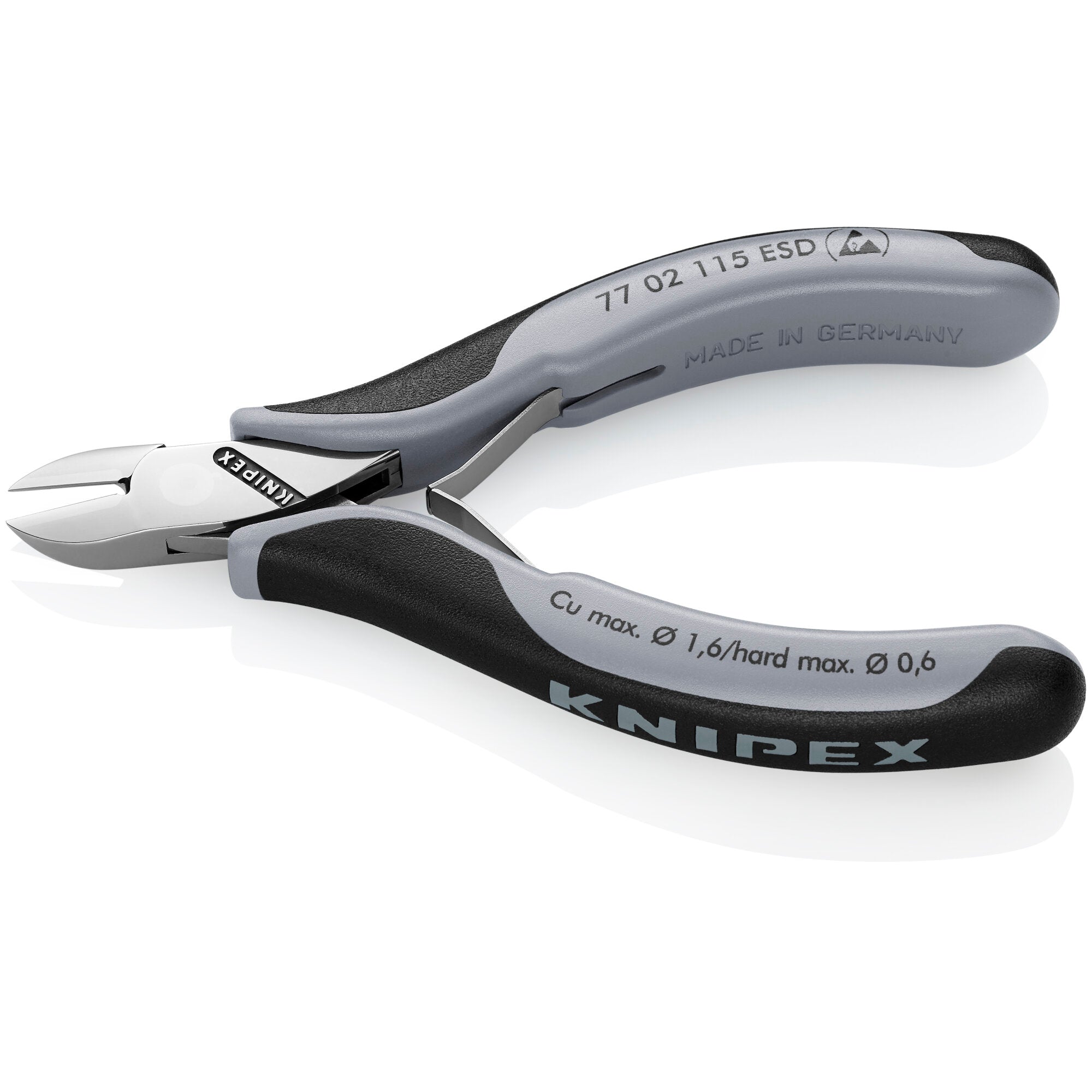 For fine cutting work in electronics and fine mechanics. Sturdy, zero-backlash box joint. Low friction double spring for gentle and even opening. The mirror polish together with a fine film of oil offer effective rust protection - no circuit faults caused by peeling chrome from plated tools. Cutting edges induction hardened (approx. 60 HRC). Cutting capacity - up to 1/16" for soft wire, 3/64" for medium and up to 1/64" for hard wire. Semi-flush with small bevel. ESD (electrostatic discharge) handles discharge electrostatic energy through the handles in a gradual and controlled manner which protects components endangered by electrostatic discharge. Ball bearing steel; laser-hardened cutting edges.
