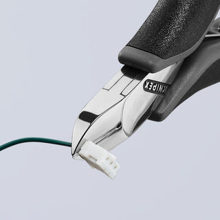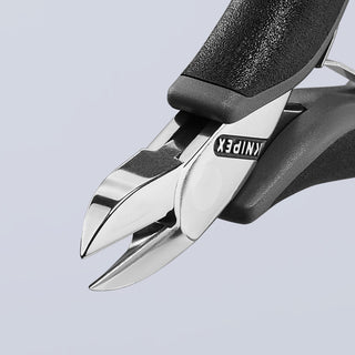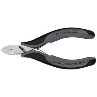 For fine cutting work in electronics and fine mechanics. Sturdy, zero-backlash box joint. Low friction double spring for gentle and even opening. The mirror polish together with a fine film of oil offer effective rust protection - no circuit faults caused by peeling chrome from plated tools. Cutting edges induction hardened (approx. 57 HRC). Cutting capacity - up to 3/64" for soft wire and up to 3/64" for medium wire. Flush cut. ESD (electrostatic discharge) handles discharge electrostatic energy through the handles in a gradual and controlled manner which protects components endangered by electrostatic discharge. Ball bearing steel; laser-hardened cutting edges. Round head. Without bevel. Handles with multi-component grips.