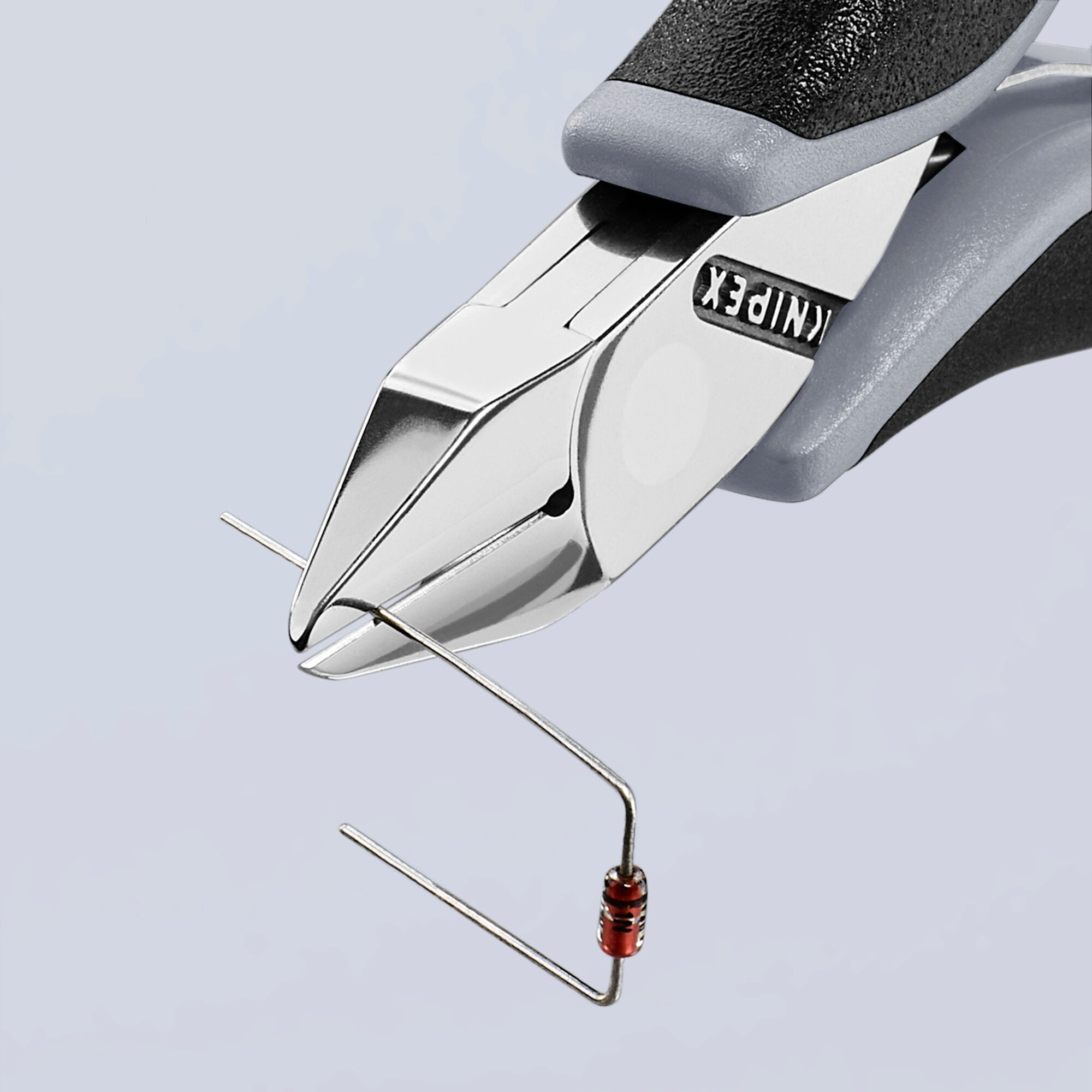 For fine cutting work in electronics and fine mechanics. Sturdy, zero-backlash box joint. Low friction double spring for gentle and even opening. The mirror polish together with a fine film of oil offer effective rust protection - no circuit faults caused by peeling chrome from plated tools. Cutting edges induction hardened (approx. 60 HRC). Cutting capacity - up to 1/16" for soft wire, up to 1/16" for medium and up to 1/32" for hard wire. Semi-flush with small bevel. ESD (electrostatic discharge) handles discharge electrostatic energy through the handles in a gradual and controlled manner which protects components endangered by electrostatic discharge. Ball bearing steel; laser-hardened cutting edges. Pointed head. Small bevel. Semi-flush cut. Handles with multi-component grips.