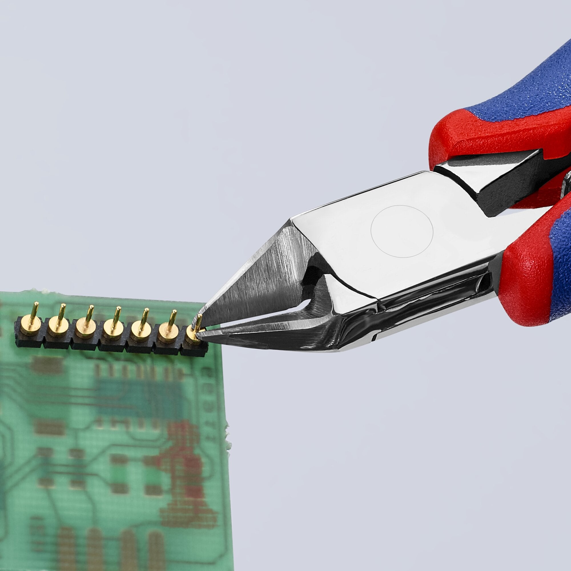 For extreme demands on cutting pliers caused by hard or tough materials, e.g. piano, nickel, tungsten and diode wire, which are used more frequently in the electronics and aerospace industries. Precision carbide metal cutting edges soldered into forged blanks. Sturdy, zero backlash box-joint. Hardness of the carbide cutting edges (approx. 80 – 83 HRC). Pliers with carbide metal cutting edges have a substantially longer service life than with conventional cutting edges. Constantly reliable cutting results due to the avoidance of cutter deformations. High cost savings due to longer service life of the pliers. Pointed head with chamfer; with small bevel. Ball bearing steel; laser-hardened cutting edges. Pliers with carbide metal cutting edges have a substantially longer service life than such with conventional cutting edges. High cost saving due to longer service life of the pliers. Pointed head with chamfer. Small bevel. Semi-flush cut.