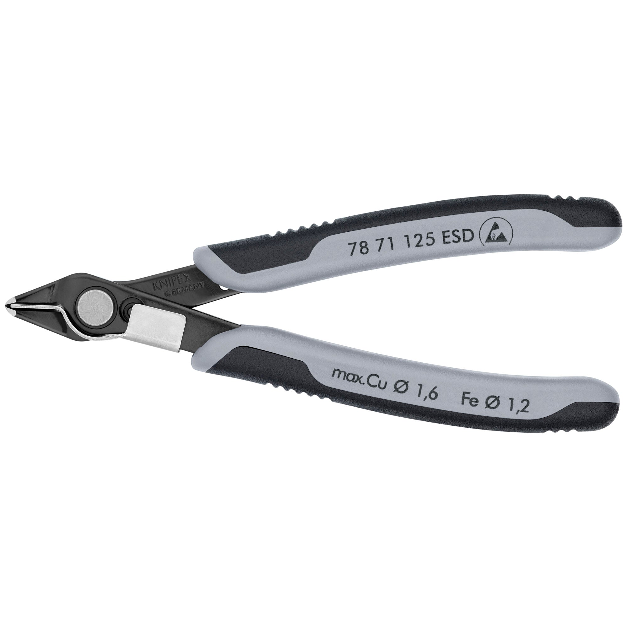 Precision pliers for ultra fine cutting work in electronics and fine mechanics. Ground, very sharp cutting edges without bevel for flush cutting perfect for cable ties. Precision shaped tips cut wires resting on a board from 1/64" (0.2 mm) diameter. Joint with stainless steel rivet. Extremely smooth movement for minimum operator fatigue. Includes opening spring for easy repetitive work. Approximately 20% lighter than conventional electronics pliers. Grooves in handle provide a steady grip when applying slight pressure. Cutting edge hardness (approx. 64 HRC). Lead catcher, no uncontrolled loss of cut wire ends. ESD (electrostatic discharge) handles discharge electrostatic energy through the handles in a gradual and controlled manner which protects components endangered by electrostatic discharge. Special tool steel, burnished.