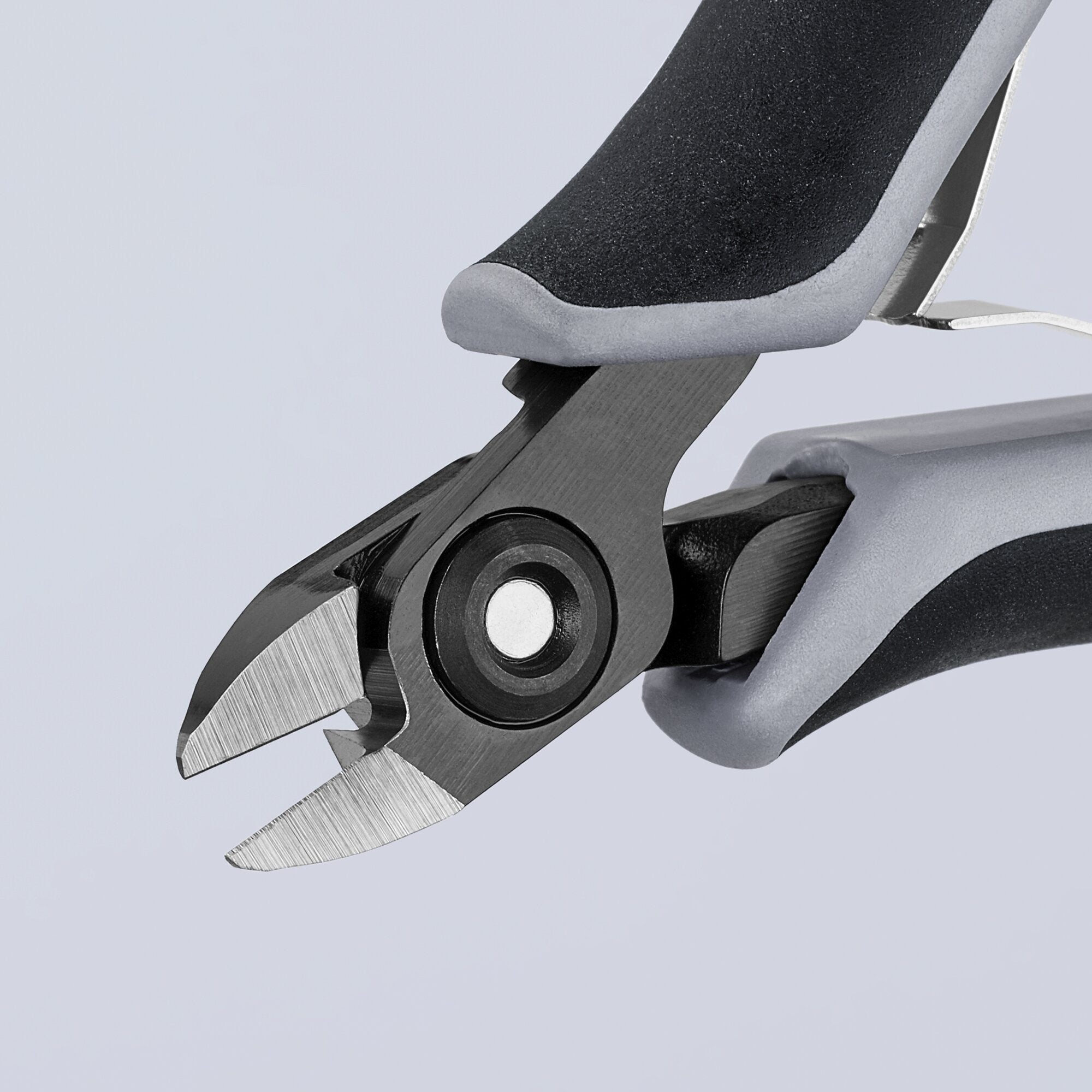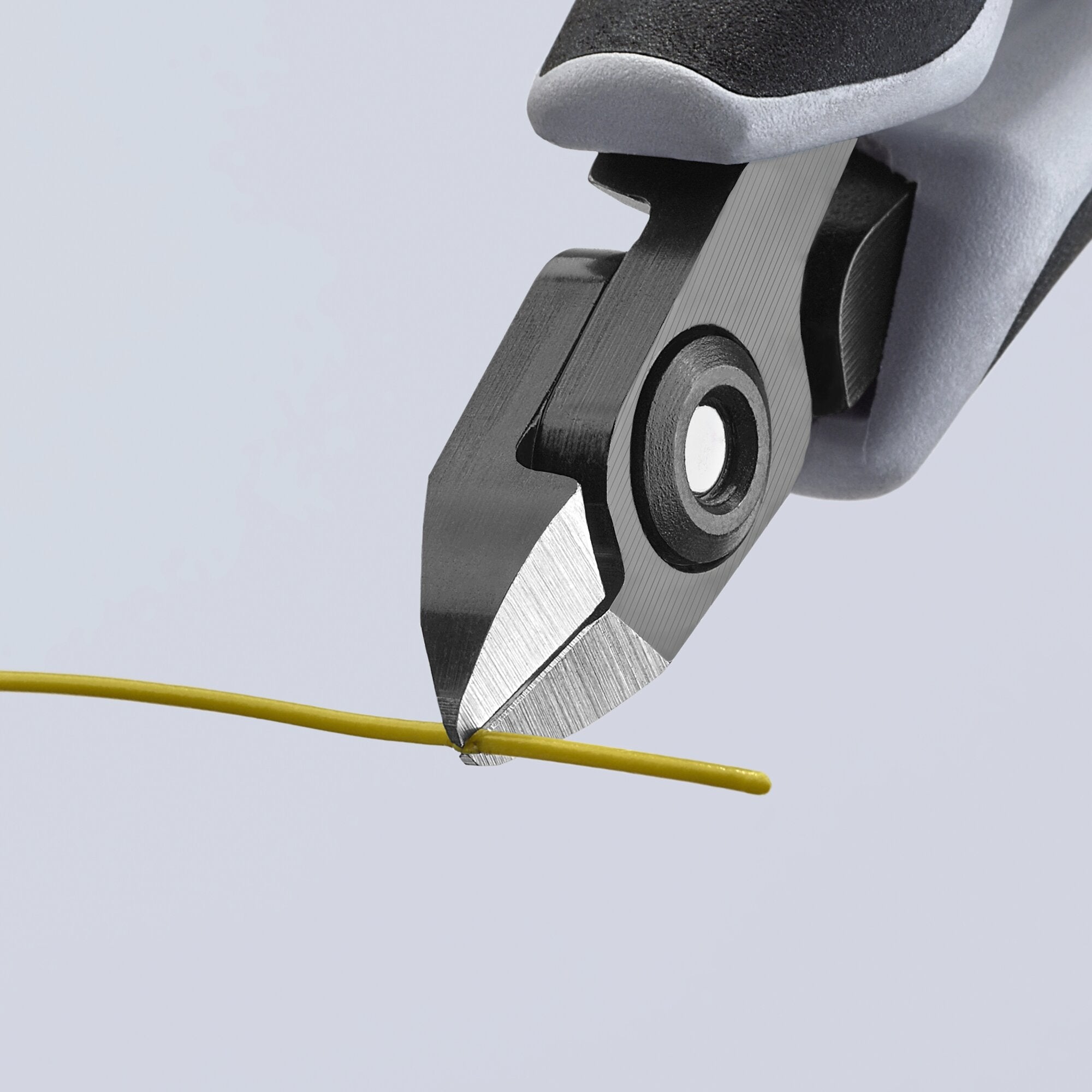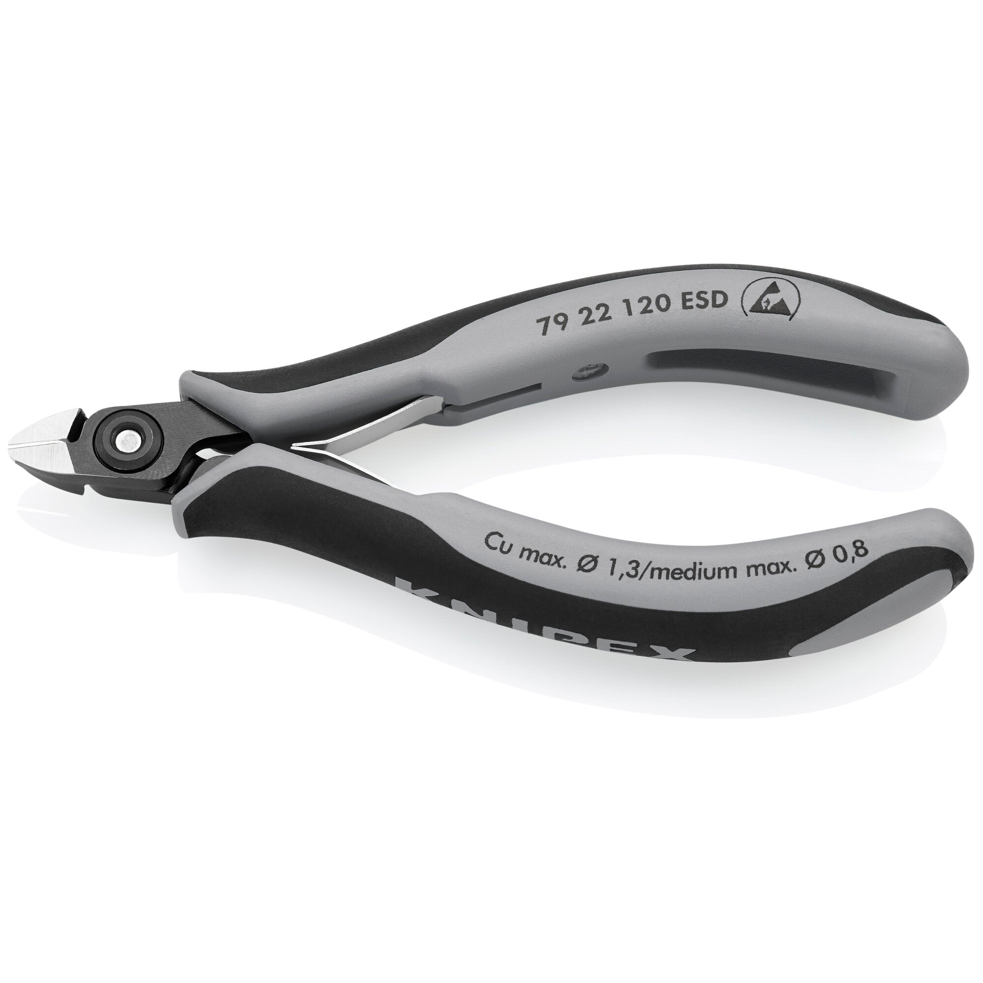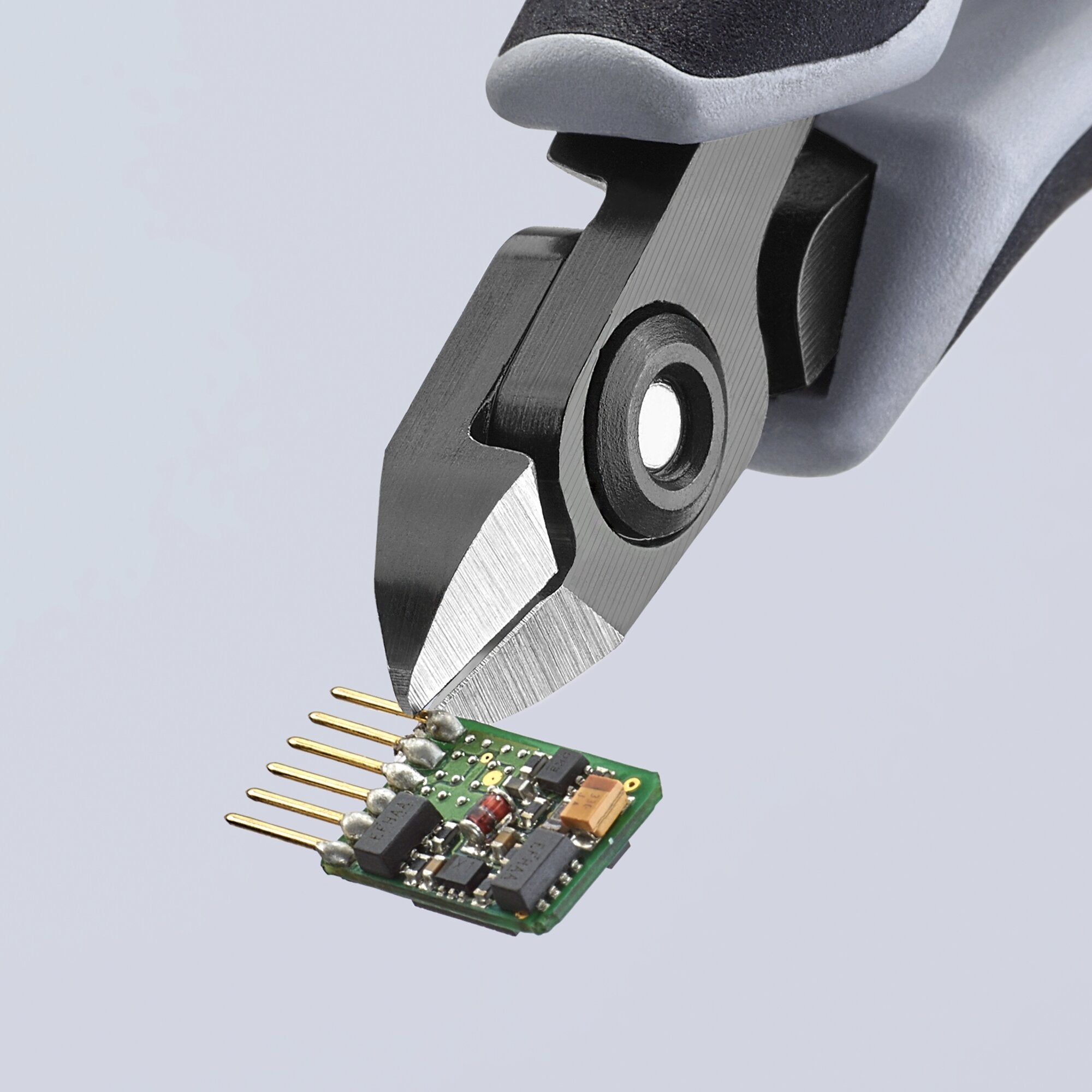 Precision pliers for ultra fine cutting work in electronics and fine mechanics. Very precisely ground and sharp cutting edges with very small bevels for precise cutting work on small electronic components. Cutting edge hardness (approx. 64 HRC). Approx. 20% lighter than conventional electronics pliers. Bolted joint with carefully manufactured joint surfaces for even,. Low-friction movement throughout the entire opening range. Double spring for a gentle and even opening. Optimized handle grips for comfort. Mini-head. ESD (electrostatic discharge) handles discharge electrostatic energy through the handles in a gradual and controlled manner which protects components endangered by electrostatic discharge. Ball bearing chrome steel; forged, multi stage oil-hardened. Flush cut. Pliers burnished.