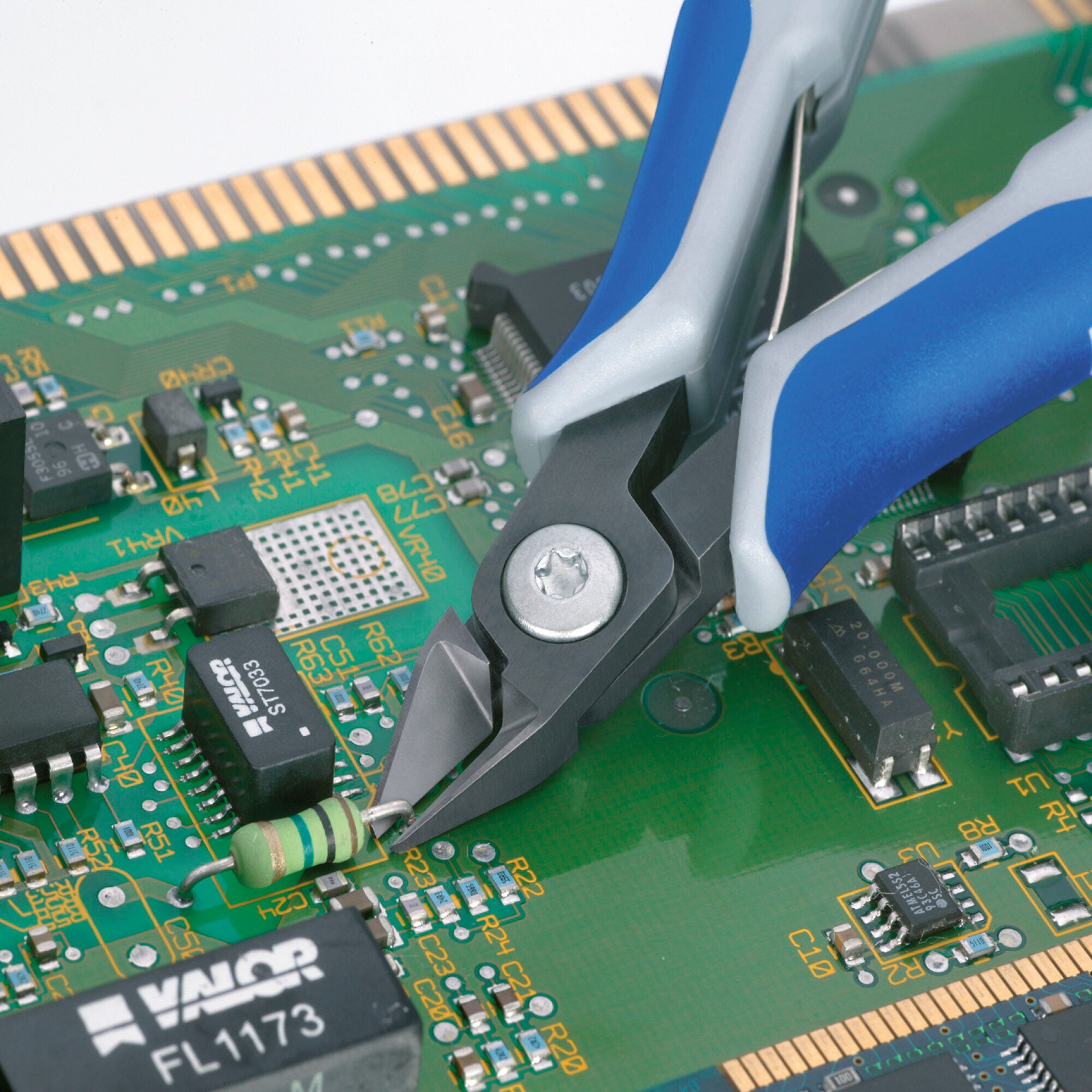 Precision pliers for ultra fine cutting work in electronics and fine mechanics. Very precisely ground and sharp cutting edges with very small bevels for precise cutting work on small electronic components. Cutting edge hardness (approx. 64 HRC). Approx. 20% lighter than conventional electronics pliers. Bolted joint with carefully manufactured joint surfaces for even movement. Double spring for a gentle and even opening. Optimized handle grips for comfort. Pointed head. Fully flush cutting. For installations with tight tolerances, for precise configuration of wire ends. Ball bearing chrome steel; forged, multi stage oil-hardened. Pointed head. Polished head.