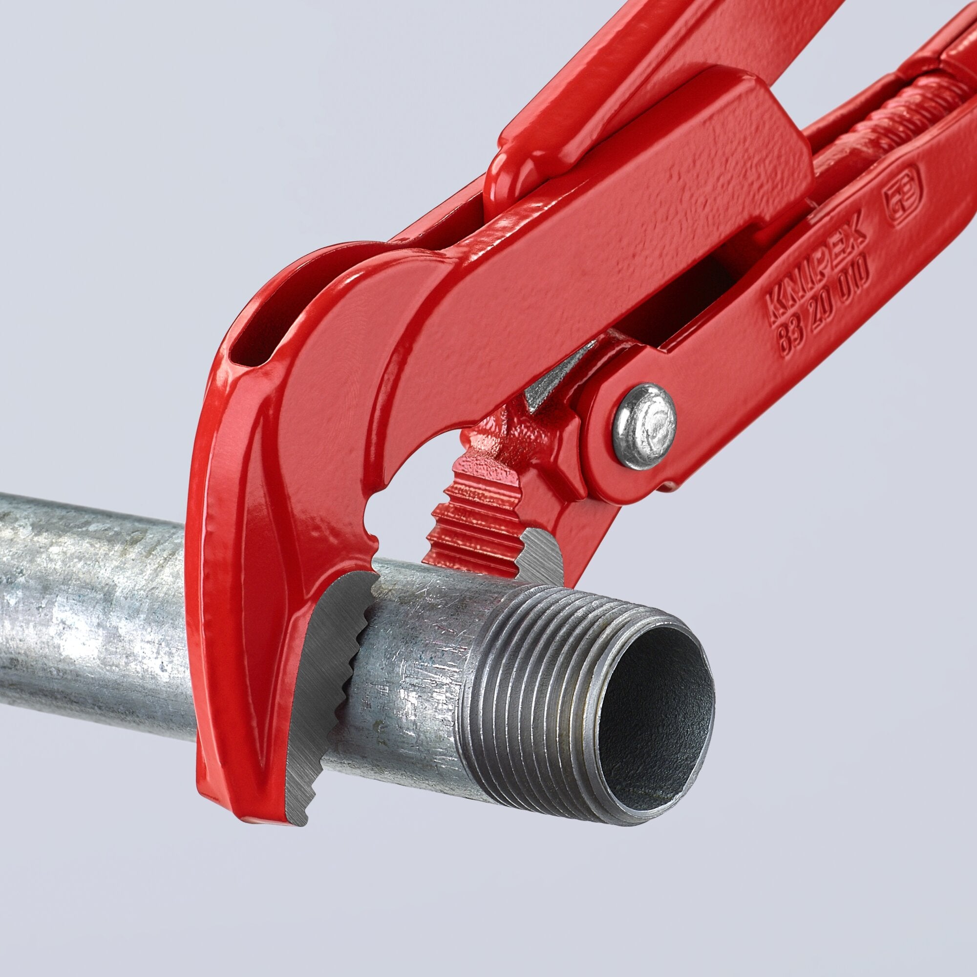 Swedish style pattern. These pipe wrenches easily adjust up & down while working in tight spaces - no need to open the handles wide. 45° angled jaws. For use on plumbing fittings and auto front end alignment. Features jaws with offset teeth in opposite direction for a strong grip. Teeth are induction hardened for greater durability and longer life. I-beam handle design for increased leverage. Captive adjusting nut. Red powder coated, jaws bright ground. Clamping width capacity up to 1 21/32. Chrome vanadium electric steel, forged, multi stage oil-hardened.