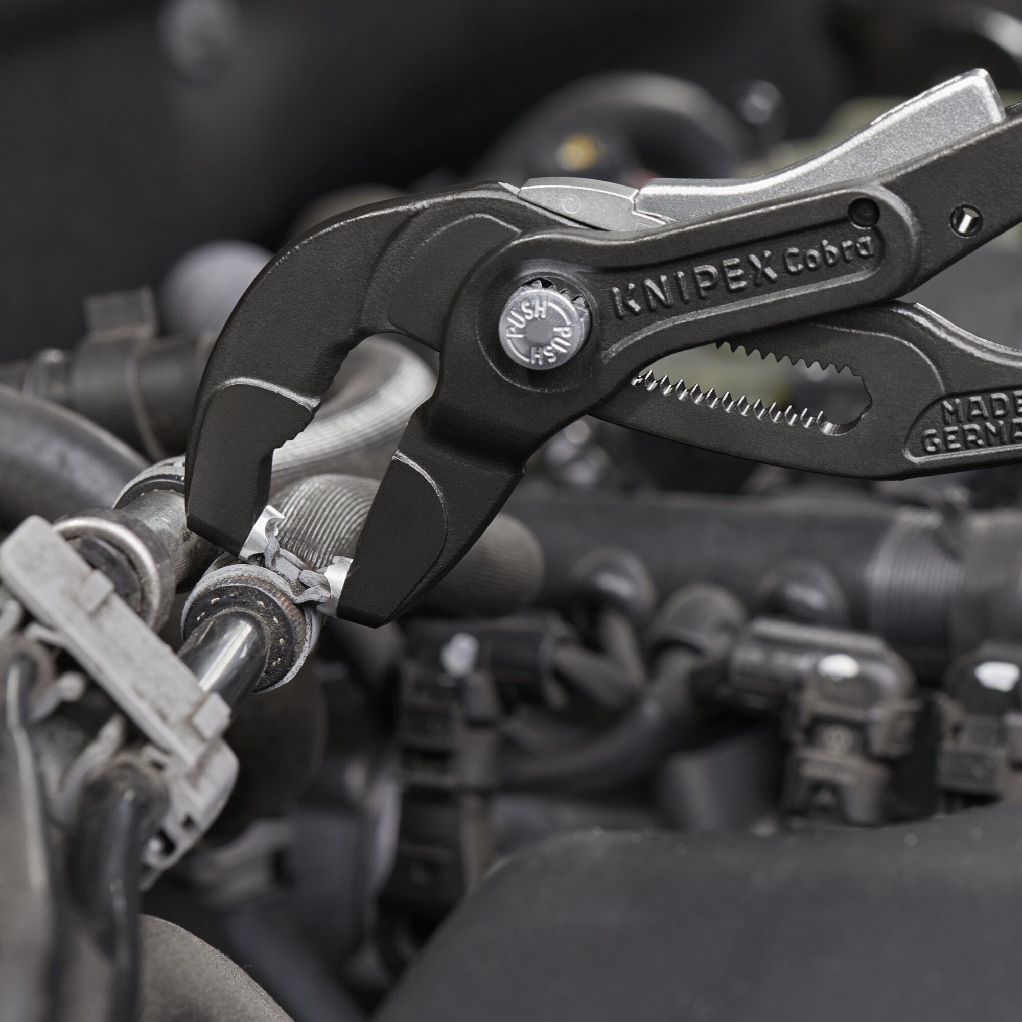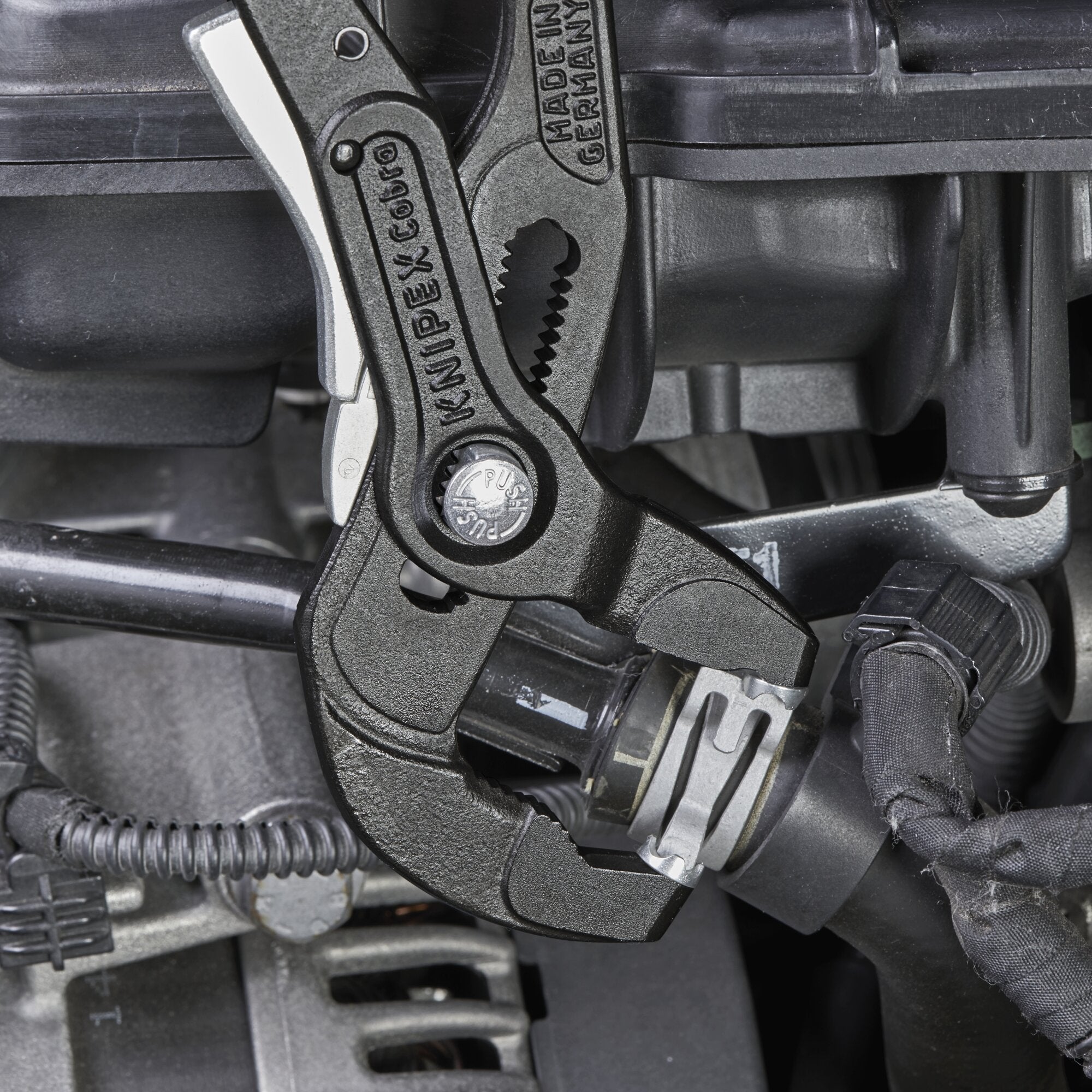 The locking device keeps the clamp open and stays locked in position without the need to grip and hold onto the pliers until the user is ready to move the clamp. One-hand release. Rotatable tips for securely gripping the clamps in all positions. Jaw inserts can also be rotated under load. Extremely good leverage which allows clamps to be opened and moved easily without great effort. 19 adjustment positions. Slim head design, narrow head width, and rotatable grip inserts make this an ideal tool especially in confined areas. Detach hoses gently using the serrated jaw behind the tips. 19 Adjustment positions. Slim head design, narrow head width and rotatable grip inserts make this an ideal tool especially in confined areas. Replacement pair of grip inserts part number 89 59 250 A. Chrome vanadium electric steel; forged, oil-hardened.