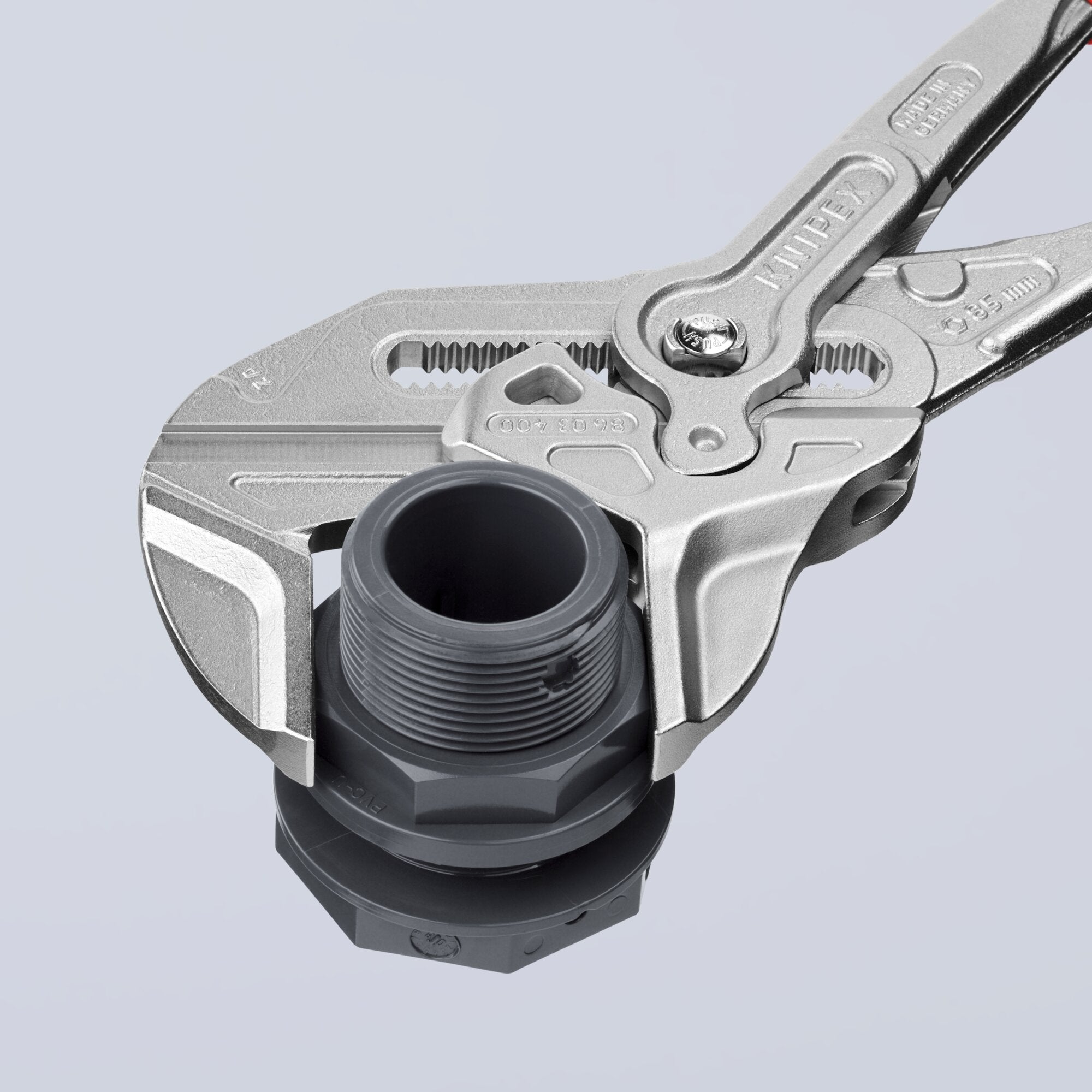 Replaces a full set of inch and metric open end wrenches up to 3 3/8" (85 mm). Excellent for gripping, holding, pressing and bending applications. Optimized adjustment to the workpiece with hand-friendly position of grips. Reliable catching of the hinge bolt: no unintentional shifting. Lever transmission greater than 10-1 for strong gripping power. Adjustable tightening tool. Replaces diverse, expensive, large open end wrenches up to 3 3/8". Parallel jaws allow infinitely variable gripping of all widths to the specified maximum size. Smooth jaws for gentle installation of quality union joints made from brass or stainless steel. Zero backlash jaw surface pressure prevents damage to edges of sensitive components. 25 adjustment positions at the touch of a button directly on the workpiece. The action of the jaws allows bolted connections to be tightened and released quickly using the ratchet principle. Chrome vanadium electric steel; forged, oil-hardened.