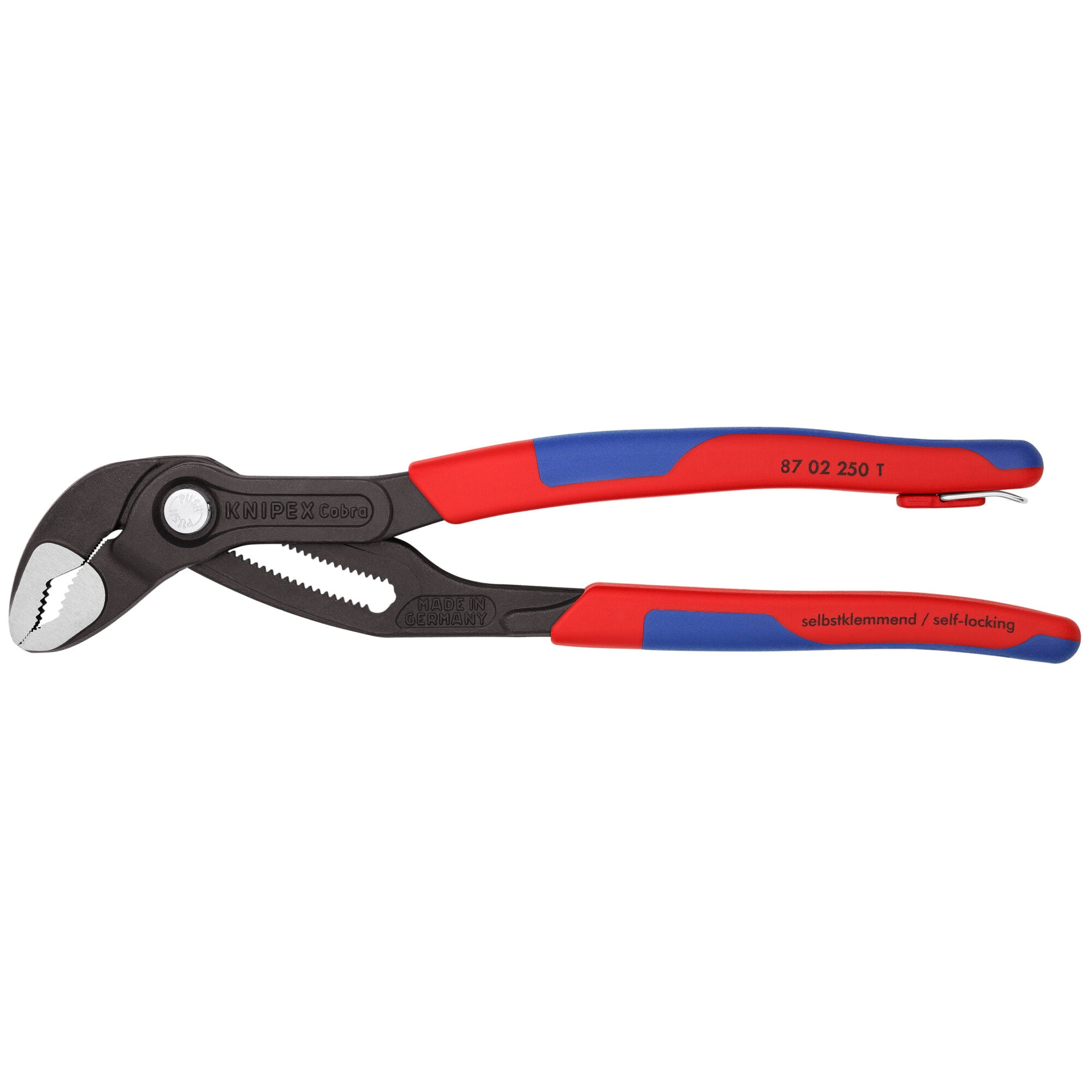 Adjustment at the touch of a button directly on the workpiece. Fine adjustment for optimum adaptation to different size workpieces and a comfortable gripping position. Self-locking on pipes and nuts: no slipping off the workpiece and low handforce required. Gripping surfaces with special hardened teeth, teeth hardness (approx. 61 HRC): low wear and reliable gripping. Box-joint design: high stability because of double guide. Reliable catching of the hinge bolt: no unintentional shifting. Pinch guard prevents operators' fingers being pinched. 25 adjustment positions. With slim, two-color multi-component sleeves for better handling and easier transport. Pliers with integrated tether attachment point for tool drop protection system. Chrome vanadium electric steel; forged, multi-stage oil-hardened.