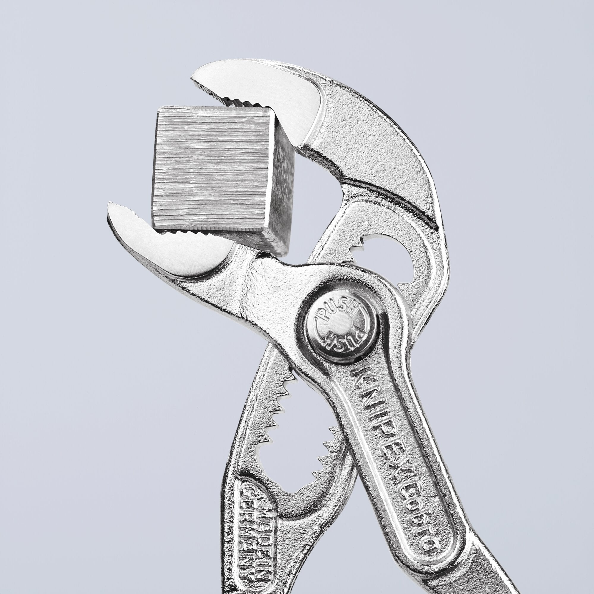 Adjustment at the touch of a button directly on the workpiece. Fine adjustment for optimum adaptation to different size workpieces and a comfortable gripping position. Self-locking on pipes and nuts: no slipping off the workpiece and low handforce required. Gripping surfaces with special hardened teeth, teeth hardness (approx. 61 HRC): low wear and reliable gripping. Box-joint design: high stability because of double guide. Reliable catching of the hinge bolt: no unintentional shifting. Pinch guard prevents operators' fingers being pinched. 13 adjustment positions. Chrome vanadium electric steel; forged, multi-stage oil-hardened.