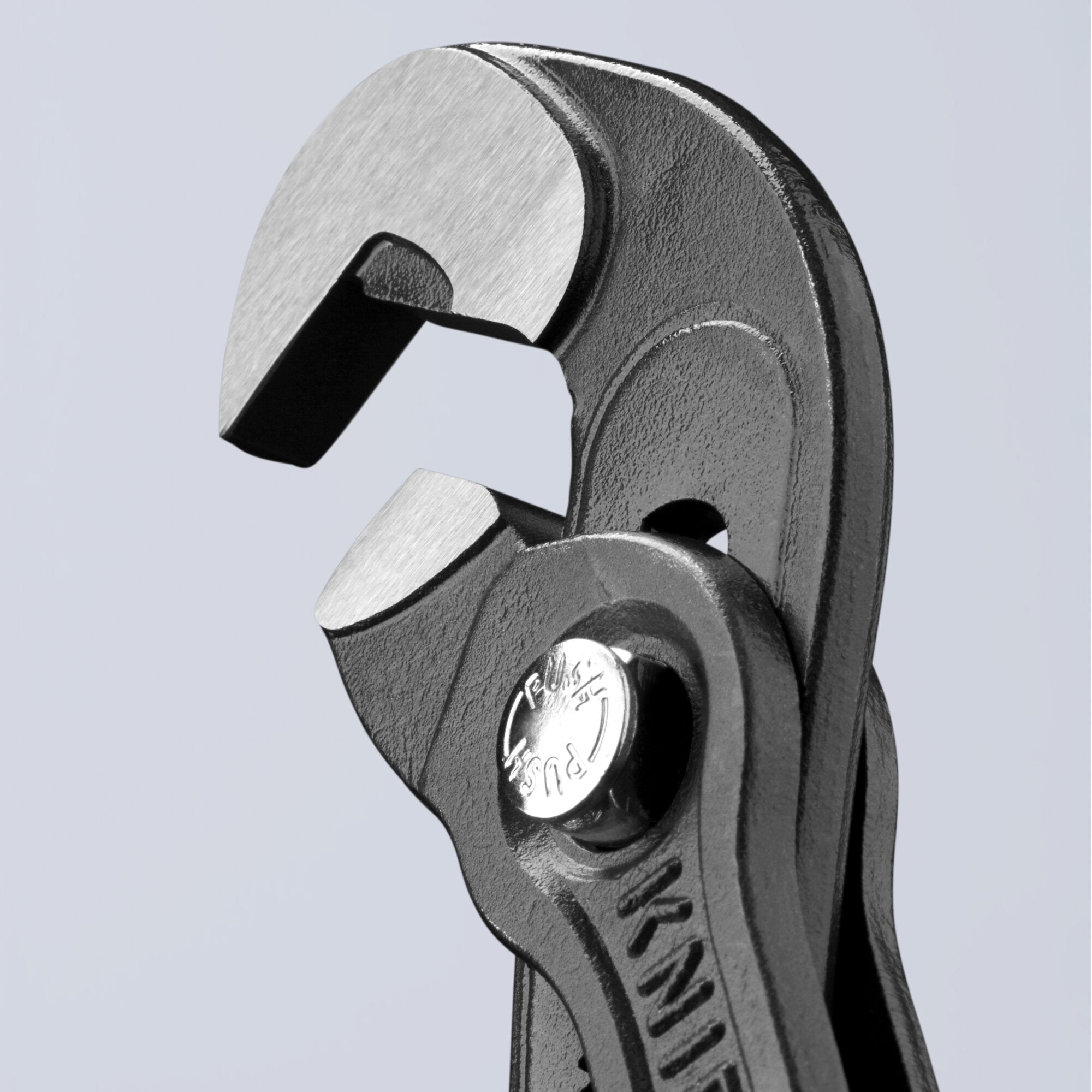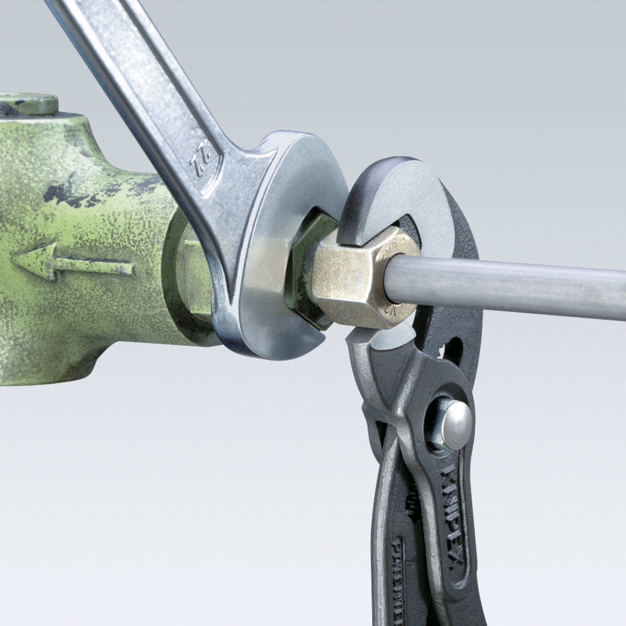 Combines the convenience of the push-button adjustment on the workpiece and the function of an all-purpose tightening tool. For use with inch and metric nuts and screws with widths across flats from 3/8" to 1 1/4" - self-locking in the range from 11/16": no slipping off the workpiece. Reliable and tight gripping of rounded, rusty or overly painted nuts and screws. Ideal for work on vehicle brake systems. Quick tightening of nuts and bolts using ratchet action. Adjustment at the touch of a button directly on the workpiece, one-hand operation. 15 fine adjustments of optimum adaptation to different size workpieces and a comfortable gripping position. Box-joint design: high stability because of double guide. Reliable catching of the hinge bolt: no unintentional shifting. Favorable lever action: optimum transmission of force. Pinch guard prevents operators' fingers being pinched. Replaces a set of wrenches, ideal for tightening locknuts. Chrome vanadium electric steel; forged, multi stage oil-hardened.