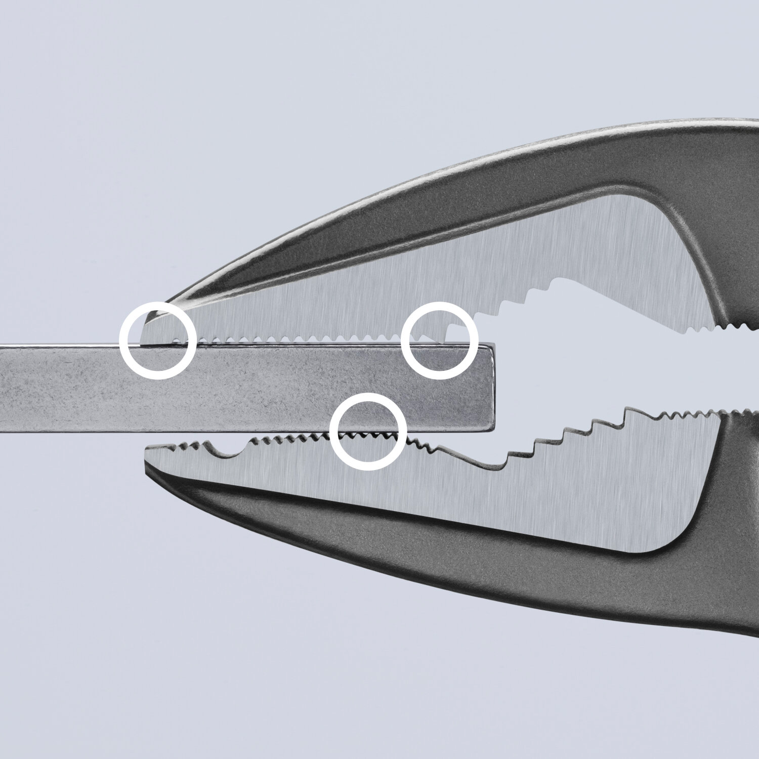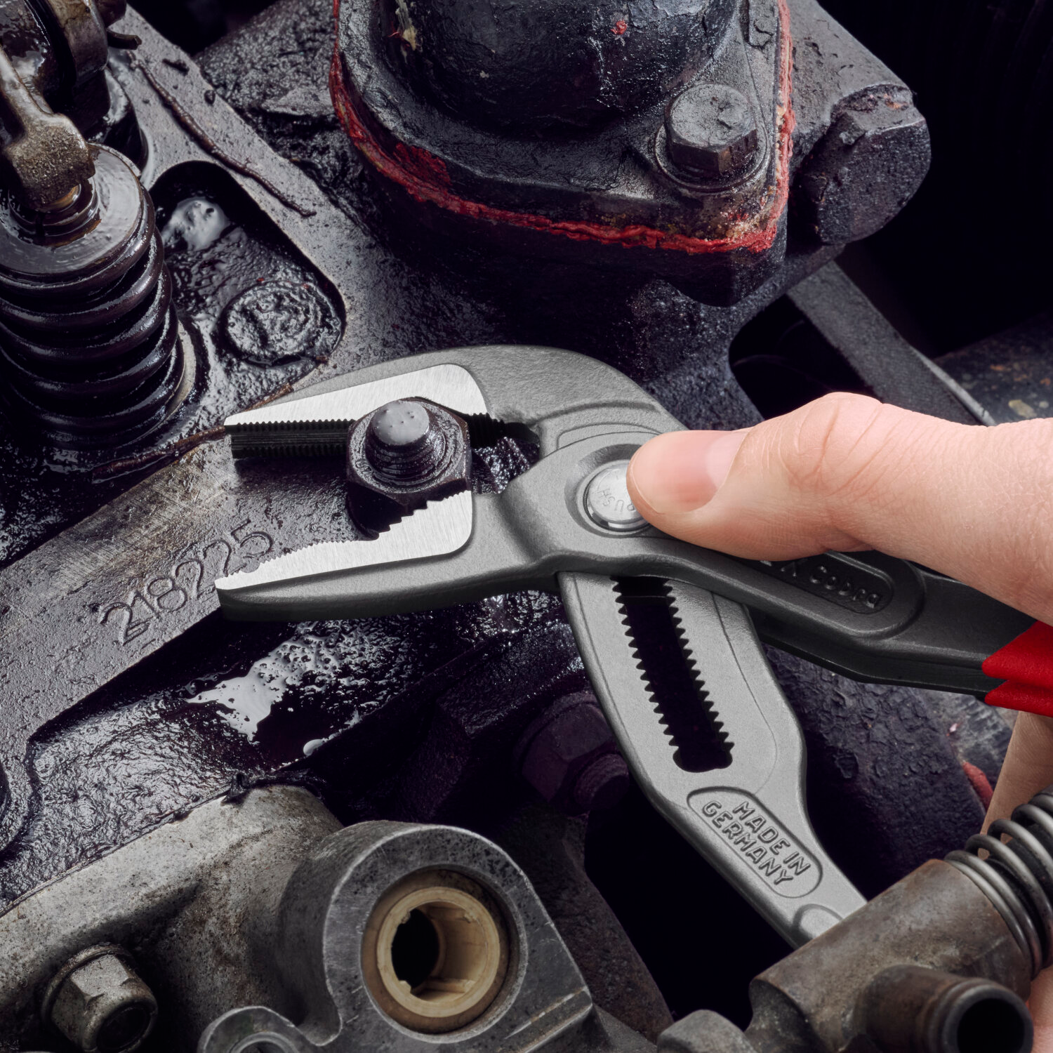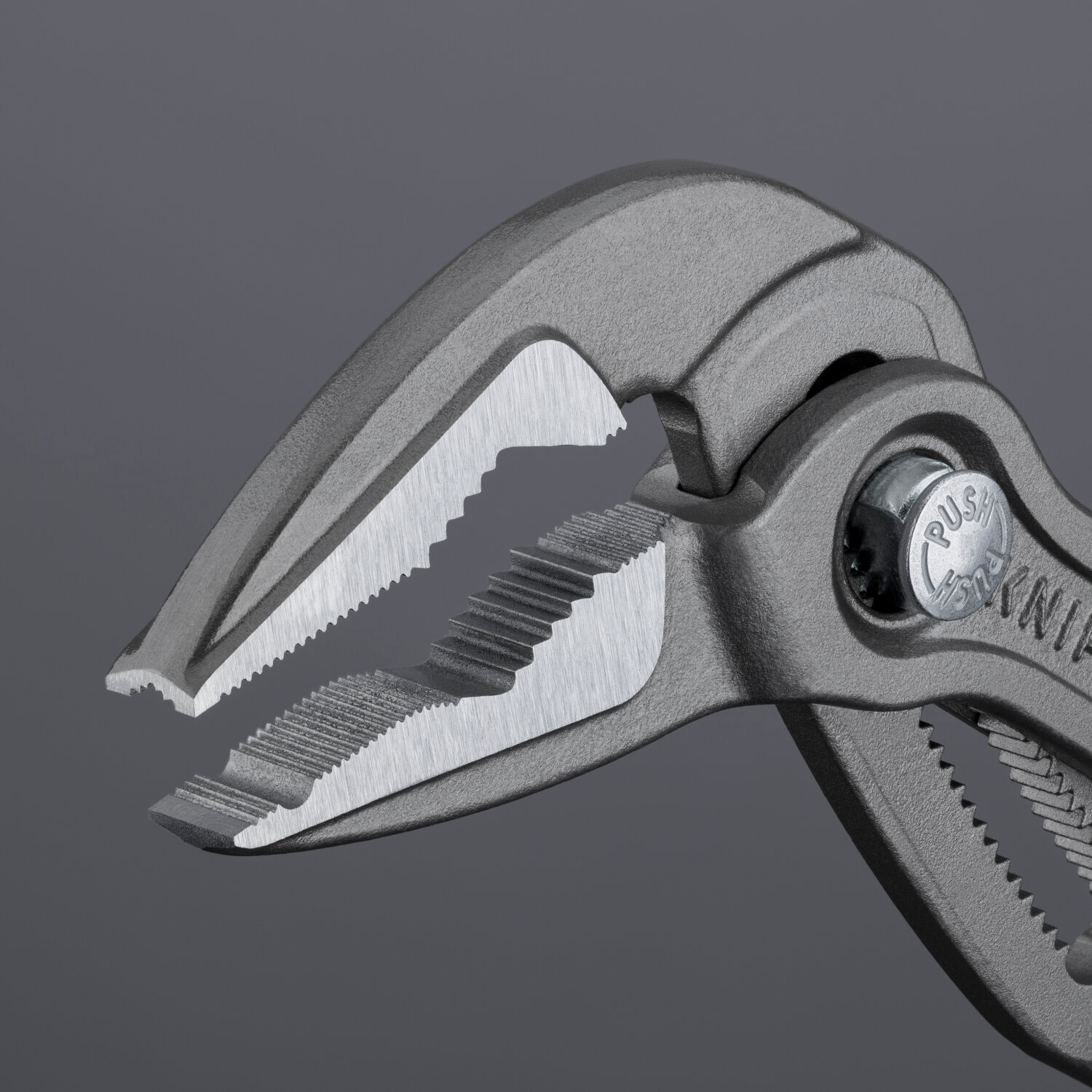 Longer and more narrow jaws compared to standard Cobra(r) pliers. Front gripping serration for round parts such as screws, bolts and wire rope. Groove near the tip for holding nails, pins and bolts. Slim head and joint construction allow for easy access to hard to reach areas. Ideal for service and maintenance, equipment repair, automotive and general industry. Firm grip on flat material due to three-point contact. Adjustment at the touch of a button directly on the workpiece.