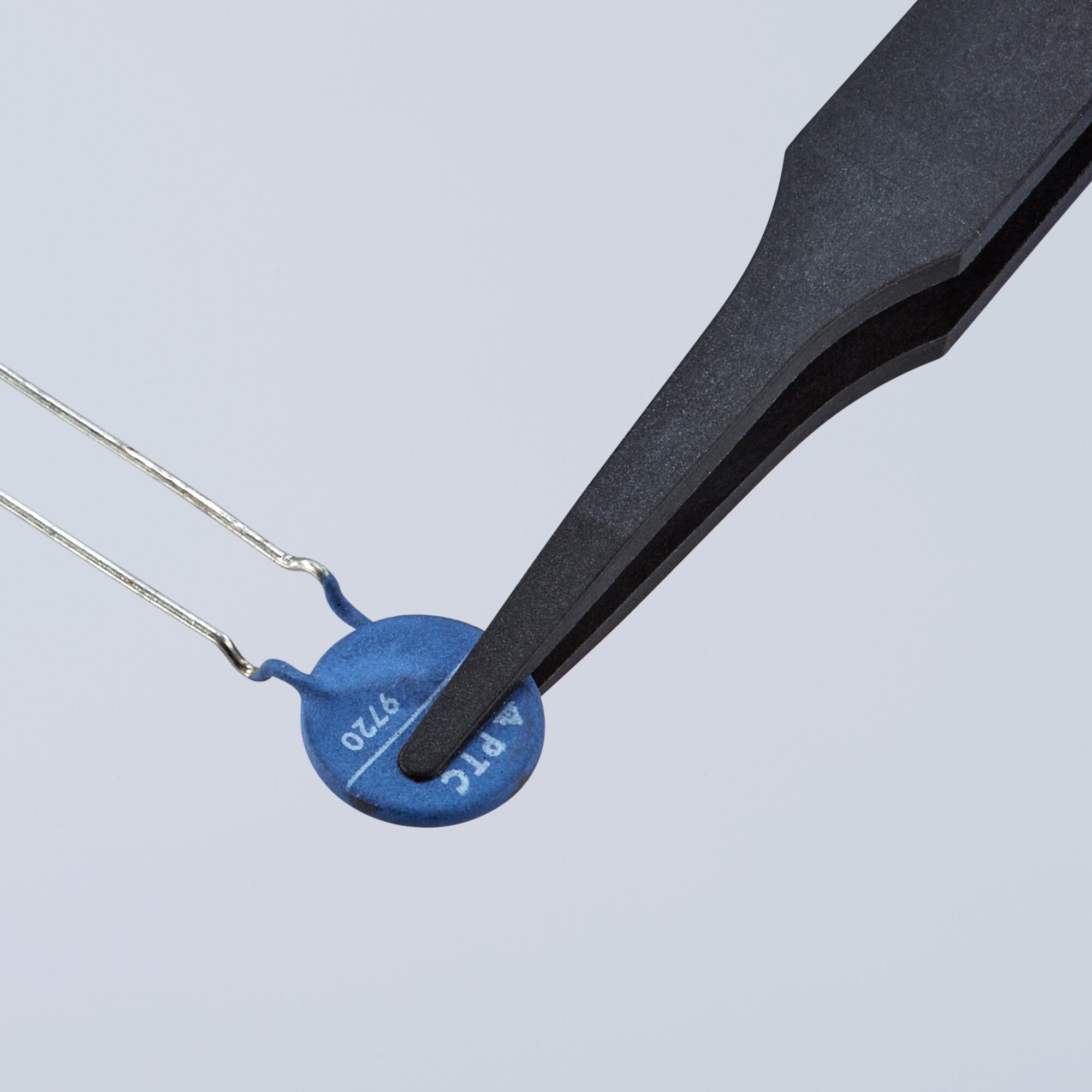 The KNIPEX ESD Plastic Tweezers Set is versatile and designed for electronics work in ESD-sensitive environments. The set includes a range of plastic tweezers with various tip shapes, allowing for precise handling and placement of delicate electronic components without the risk of electrostatic discharge. The ESD-safe plastic construction of the tweezers ensures optimal protection against static electricity, making them an essential choice for professionals in the electronics industry.. ESD plastic tweezers offer maximum surface protection when handling sensitive electronic components, micro-mechanical parts, as well as glass and ceramic components. Good chemical resistance to most oils, lubricants, fuels and nonpolar solvents. The plastic and carbon fiber tips are flexible, fatigue-resistant, vibration-dampening and water-repellent. 92 09 01 ESD, 92 09 04 ESD and 92 09 05 ESD - Plastic Gripping Tweezers-Blunt Tips-ESD. Blunt tips offer a firm grip but won't damage surrounding components. 92 09 02 ESD - Plastic Gripping Tweezers-Needle-Point Tips-ESD. Needle-point tips offer extra-fine gripping on very small components and wire. 92 09 03 ESD - Plastic Gripping Tweezers-Pointed Tips-ESD. Pointed tips offer precise gripping of fine components. Seven compartment tool roll made of hard-wearing polyester fabric.