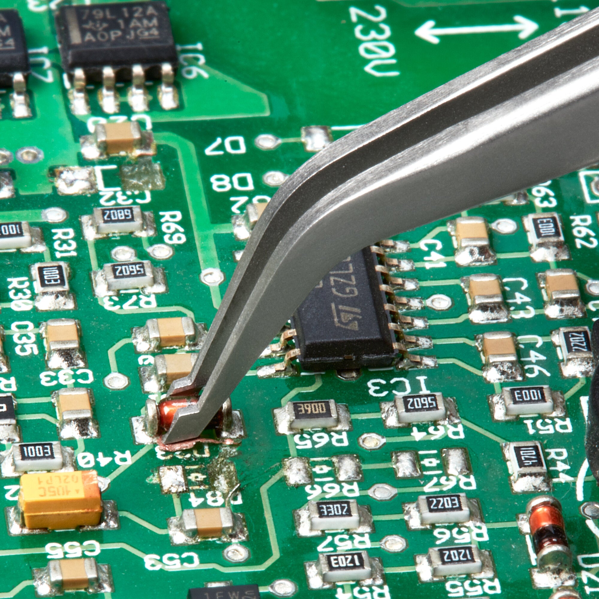 Premium stainless steel resists most chemicals, salts and acids. Angled tips make it easier to reach and grasp objects in tight or hard-to-reach spaces. Positioning tips offer exact positioning of components when working on surface mounted devices (SMD). Smooth gripping surface will not mar fine components. Smooth handles minimizes any potential interference with surrounding materials. 80% anti-magnetic design minimizes magnetic interference. High temperature and excellent chemical resistance. SMD (surface mounted device) tweezers position electronic components to be soldered directly onto the circuit board.