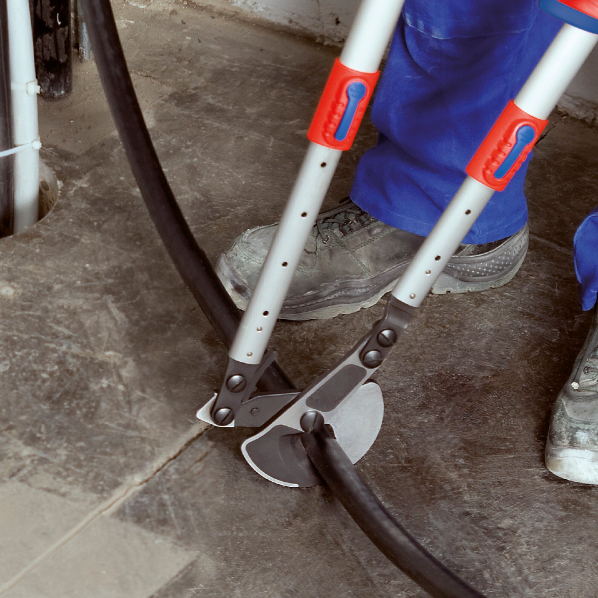 Cable shears with adjustable telescopic handles allow angular positioning. For cutting cables up to 1 1/2" (38 mm) in diameter, handles can be positioned at an angle to set the optimum handle width, great for work in confined areas. Lightweight tool for comfortable work. Heavy-duty telescopic handles made of oval aluminum tubing; extendable up to 30" (770 mm) for maximum leverage on large cable diameters; retractable down to 22" (570 mm) for minimum space requirements during transport. Replaceable cutting head part number 95 39 038. extensive cutting range up to 1 1/2" (38 mm) dia. Or 550 MCM (280 mm²) in copper and aluminum cables. Easier, neater cut due to optimized cutting edge geometry. Adjustable bolted joint. Cutting head is made of special quality, high-grade tool steel, oil-hardened. Handles are made of high-strength oval aluminum tubing.