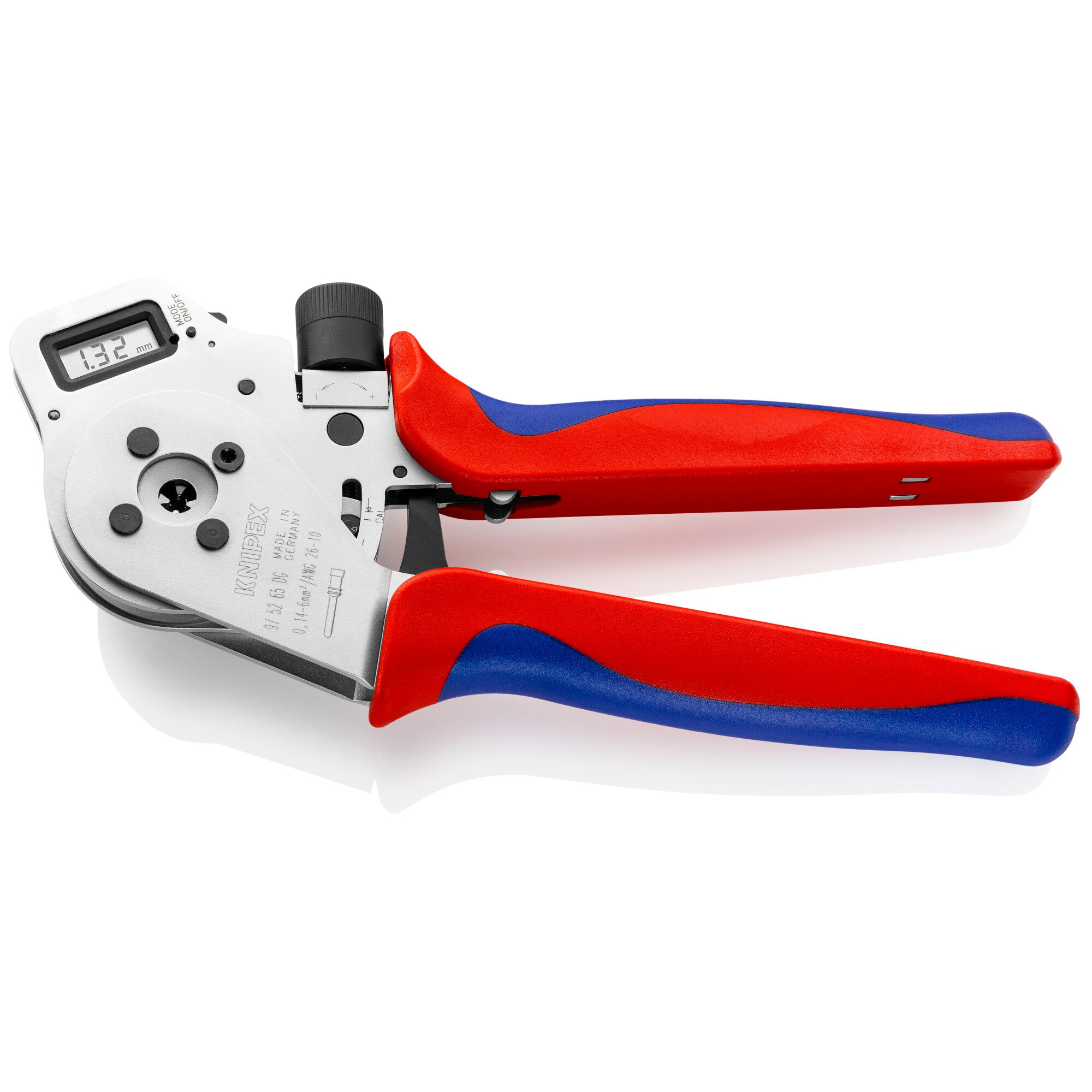 Four mandrel crimping pliers for turned contacts. For crimping turned contacts. Capacity - 0.14 to 6 mm² and 26 to 10 AWG. Four-mandrel crimping for top-quality crimping connections. Mandrel gauge to check the basic setting. Repetitive, high crimping quality due to integral lock (self-releasing mechanism). Optimum transmission of force due to highly effective lever action for fatigue-reduced operation. Comfortable multi-component grips. Crimping capacity can be adjusted in increments of .0004" (0.01 mm); with digital display of the preset crimping capacities; adjustment in mm, inches or comparable selection positions according to MIL; with table for calculating the settings; packaged in a plastic case with foam insert and locator for holding the contacts. Chrome vanadium electric steel in special quality; oil-hardened.