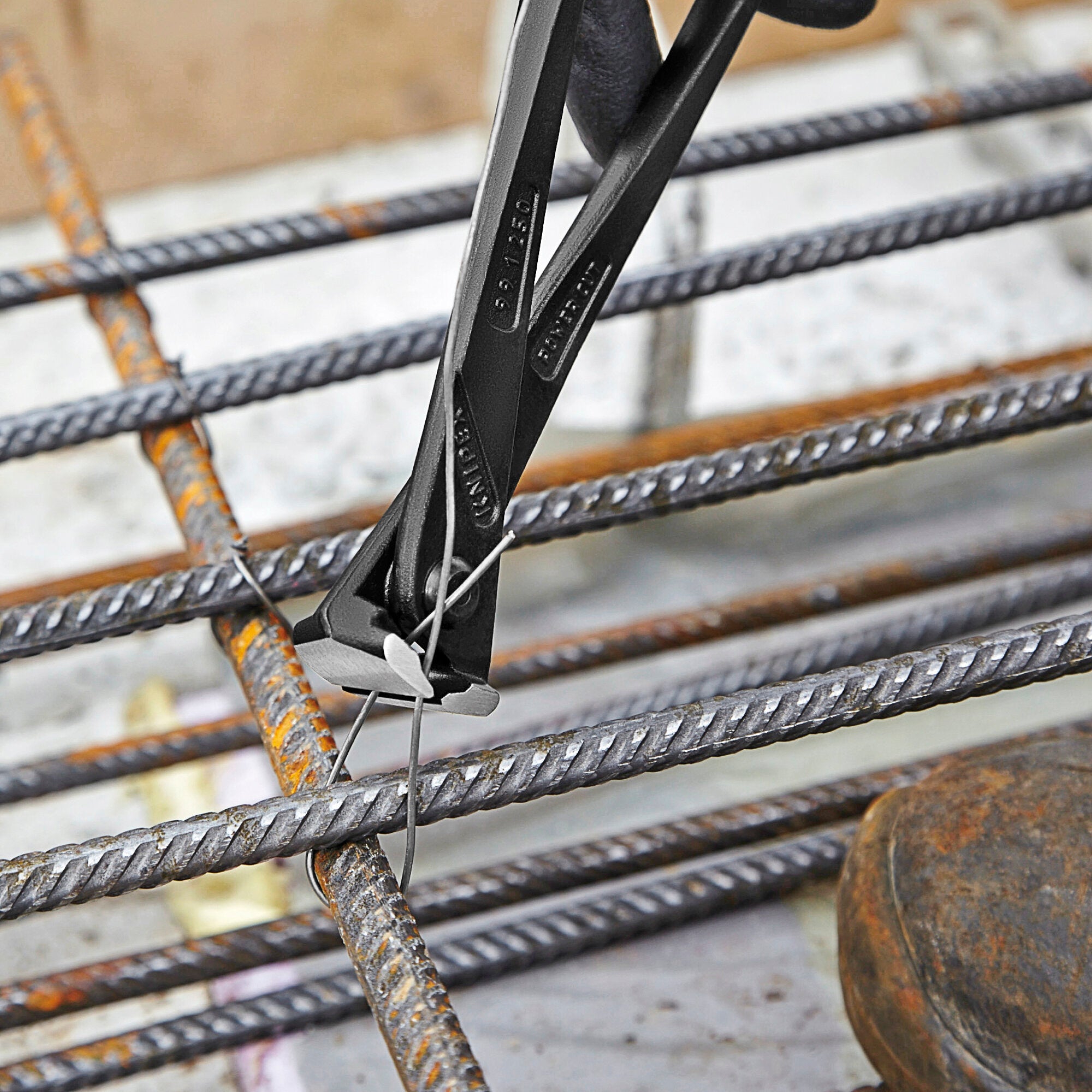 25% less effort required compared to conventional concreters' nippers of the same size. Extra-slim form for tying deep mounted steel rods. For use when working with concrete steel and binding wire. Twists and cuts wire in one operation. High leverage joint minimizes strain when working with thick binding wires. Cutting edge hardness (approx. 61 HRC). High-grade special tool steel; forged, multi stage oil-hardened.