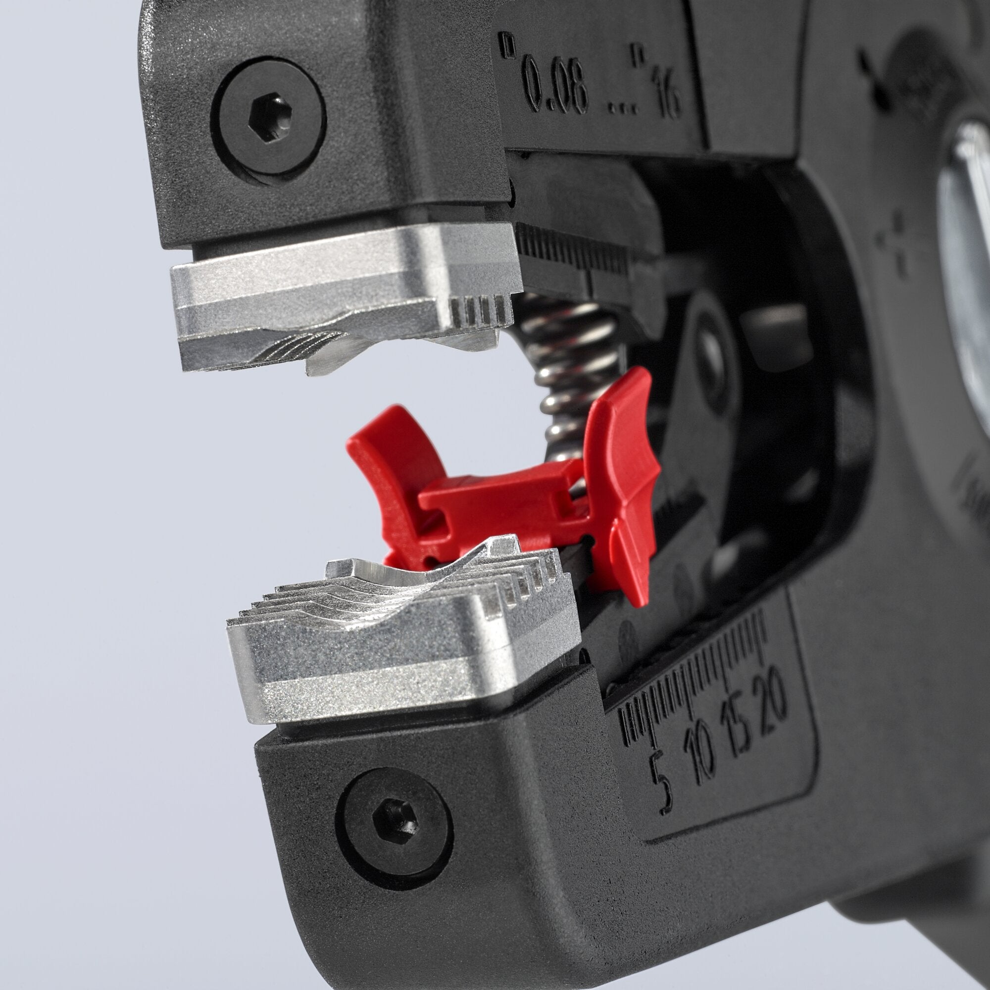 Does not strip THHN wire. Strips very fine, flexible wire as well as solid conductor. Simple, precise stripping and cutting of fine wires and solid round cables with a wide capacity range between 28 to 6 AWG (0.08 to 16 mm2). Semi-circular grooved jaws hold the wire firmly in place as the parabolic blade removes the outer insulation. Fine adjustment dial enables accurate setting of the blade to special material requirements. Adjustable length stop, perfect for repetitive applications. Tether attachment works with KNIPEX tool tether system. Customizable with a space to write your name on the inside of the handle. Comfortable to use with dual-component handle. Easy to replace blade cassette. Durable - constructed of fiberglass reinforced plastic.