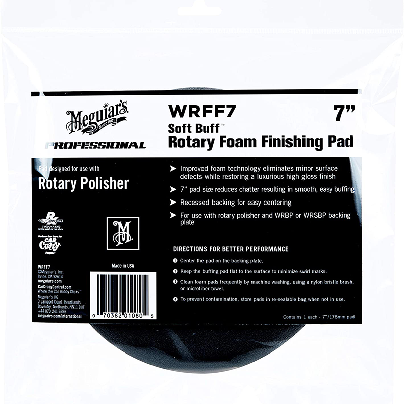 Improved foam technology allows Meguiar's® WRFF7 Soft Buff Rotary Foam Finishing Pad 7" to eliminate minor surface defects while restoring a luxurious high gloss finish. 7" pad size reduces chatter resulting in smooth, easy buffing. Recessed backing for easy centering. For use with Rotary Polisher and Meguiar's® Rotary Backing Plate - WRBP or Meguiar's® Soft Rotary Backing Plate - WRSBP backing plate.