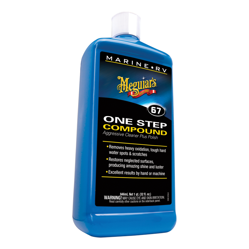 Meguiar's® Marine/RV One Step Compound is an advanced aggressive, yet safe cutting compound with polish that cleans and restores gloss to gel coat surfaces in one step. It removes moderate to heavy oxidation, scratches, stains, and tough water spots on all fiberglass and painted gel coat marine or RV surfaces. Incredible results by hand or by machine.
