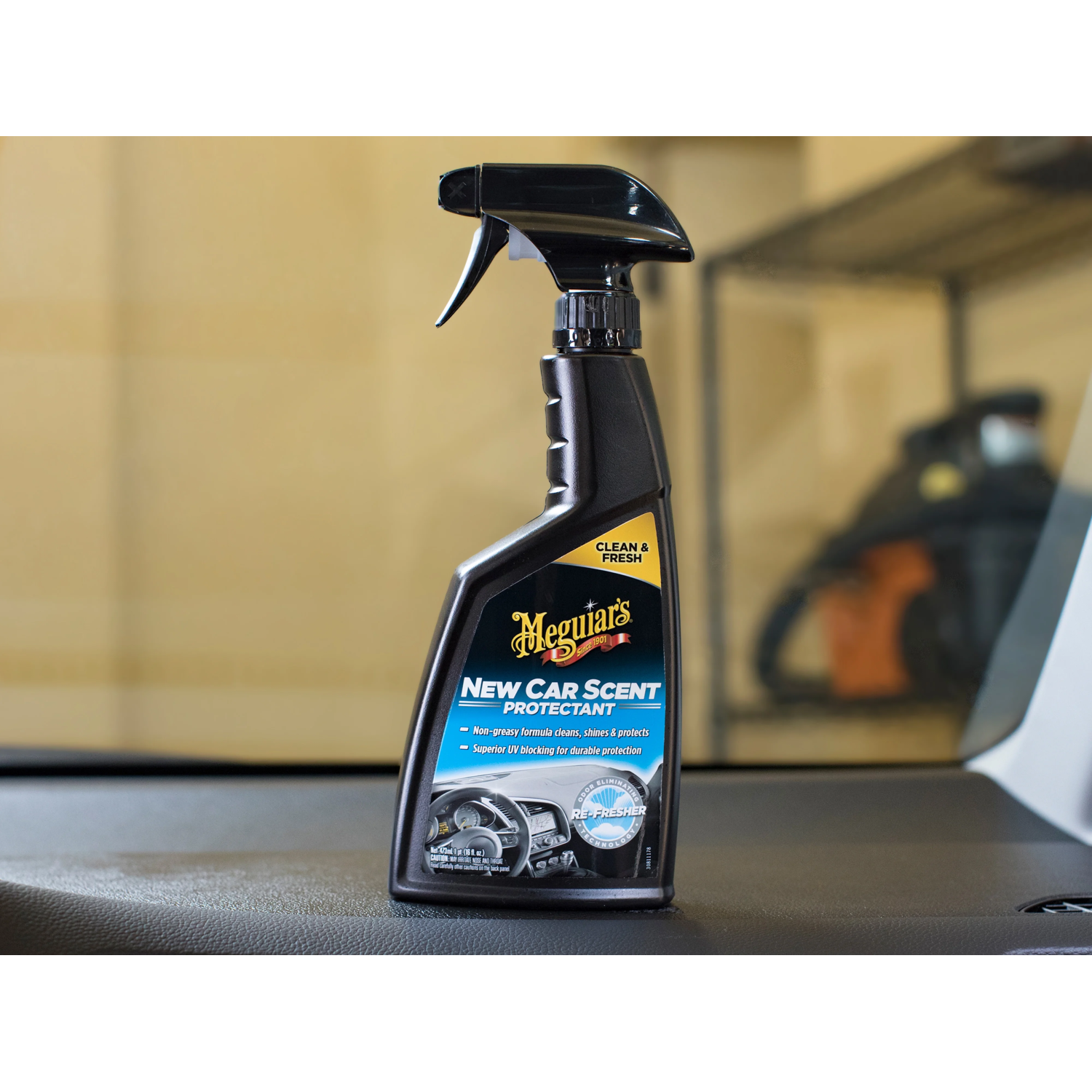 Meguiar's® New Car Scent Protectant is a versatile formula that cleans, shines and protects your car's interior surfaces while leaving behind a refreshing New Car scent that even eliminates unwanted odors from interior surfaces.* New Car Scent Protectant will help remove daily dirt and grime while providing rich darkness and satin sheen to vinyl, rubber and plastic surfaces. UV blocking agents also help keep interior surfaces protected and looking "like new". This premium formula will eliminate unwanted odors and leave behind a pleasant New Car scent that will make your vehicle's interior smells as good as it looks. *Meguiar’s Re-Fresher technology permanently removes existing bad odors through chemical bonding at a molecular level.