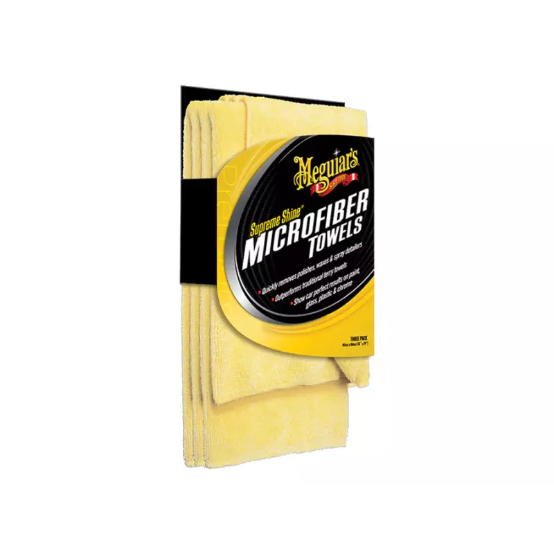 The 3 Pack of Meguiar's® Supreme Shine is an incredibly plush microfiber towel that produces swirl free, mirror-like results. The thick, deep dual-sided microfiber pile absorbs two times more than traditional terry towels providing faster wipe off with less strokes.