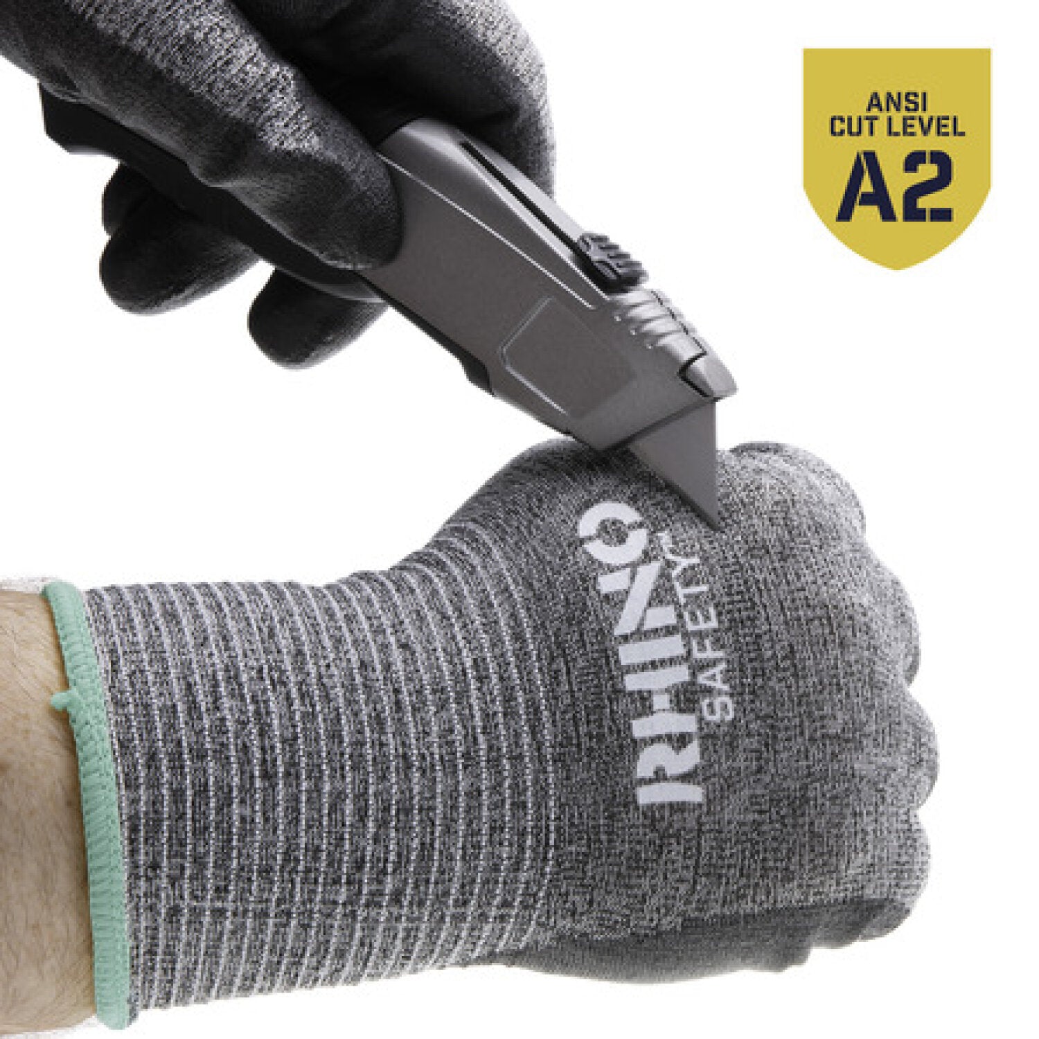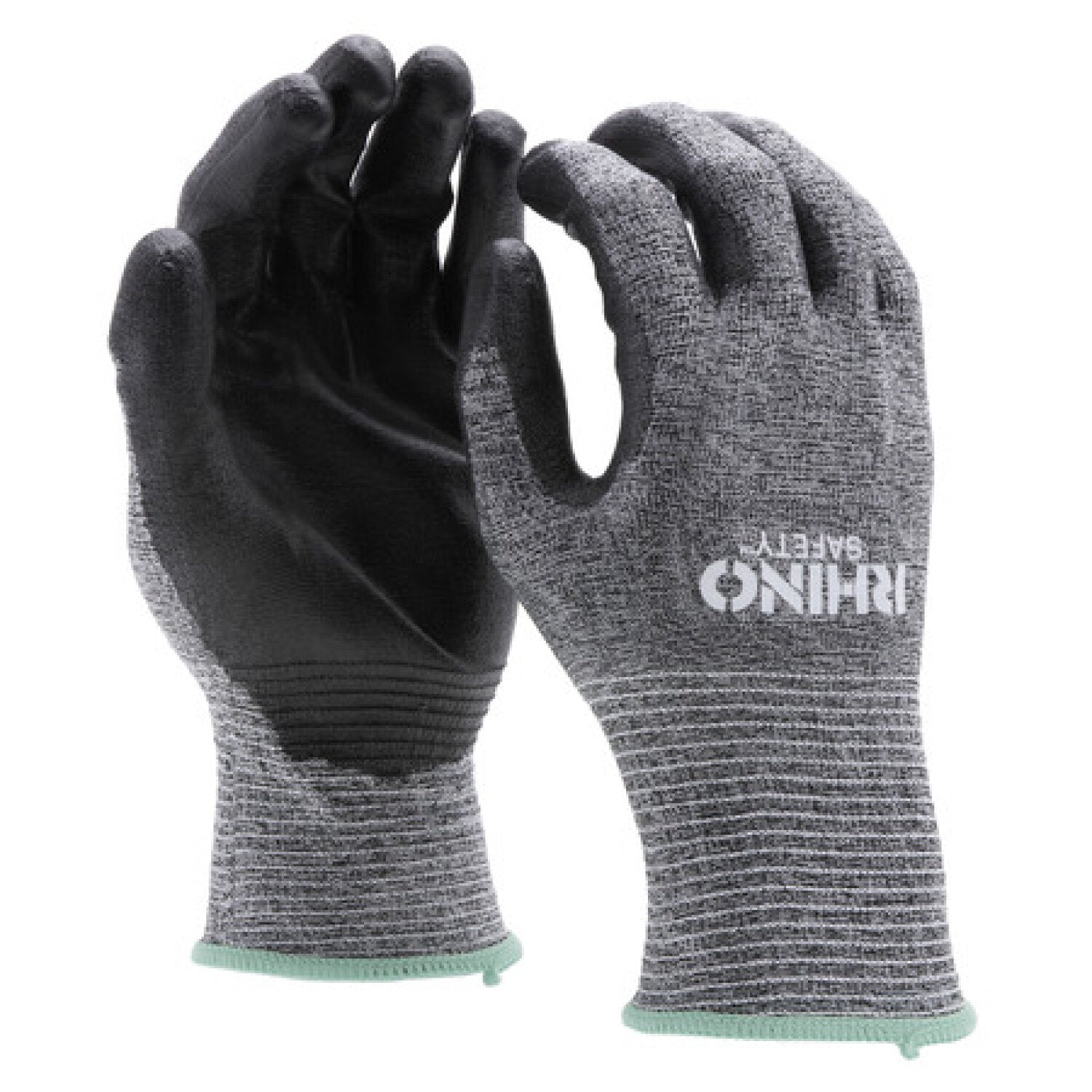 Rhino personal protection equipment provides safety on the jobsite and beyond. These 13-gauge gray HPPE nylon comfortable safety gloves protect your hands and improve your grip, with a palm-dipped polyurethane coating that resists abrasion, oils and chemicals.