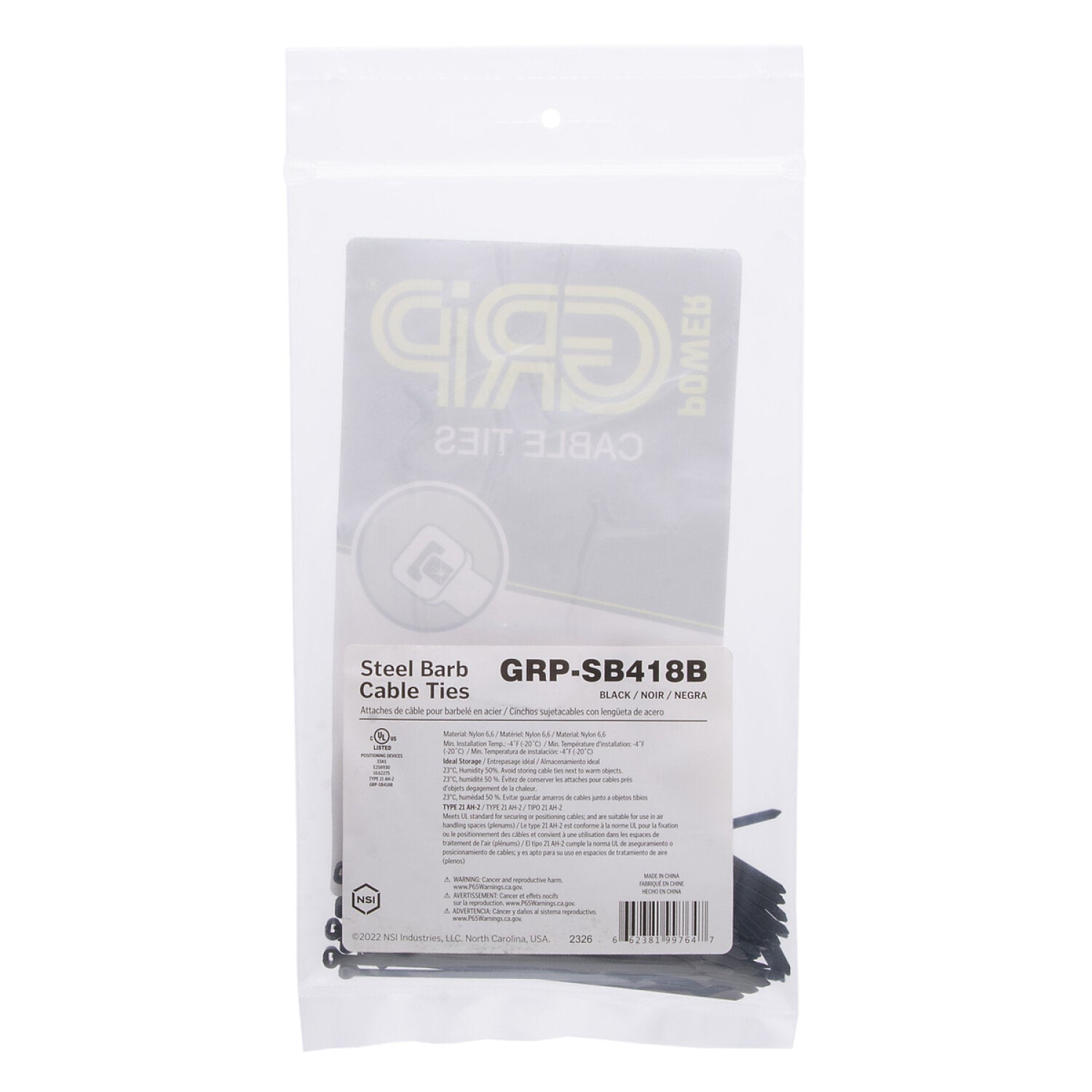 NSI GRP-SB418B 4”, Black Steel Barb 18lb Cable Tie, 100 Pack