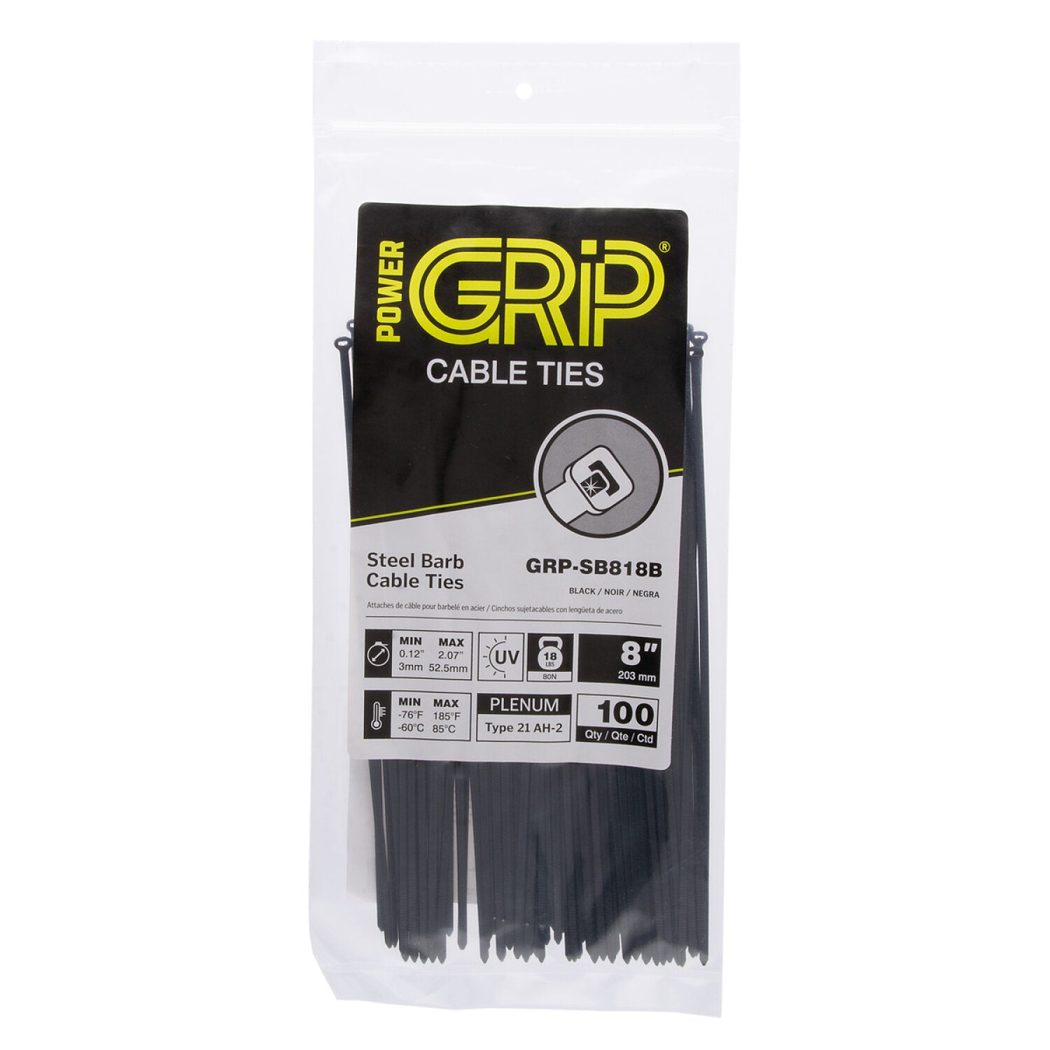 PowerGRP cable ties are guaranteed rugged and powerful, with professional-grade strength and a versatile design. The steel barb locking mechanism provides a secure grip with unlimited positions in heavy-duty application.