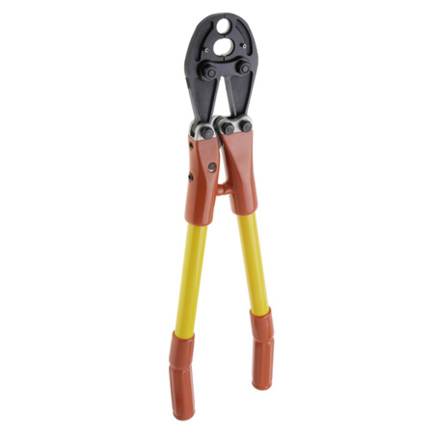 NSI Manual mechanical crimp for WR series/H-tap connector with fiberglass handle and 'O' and 'D' nose dies. Output: 4.5 tons. For copper and aluminum cables.